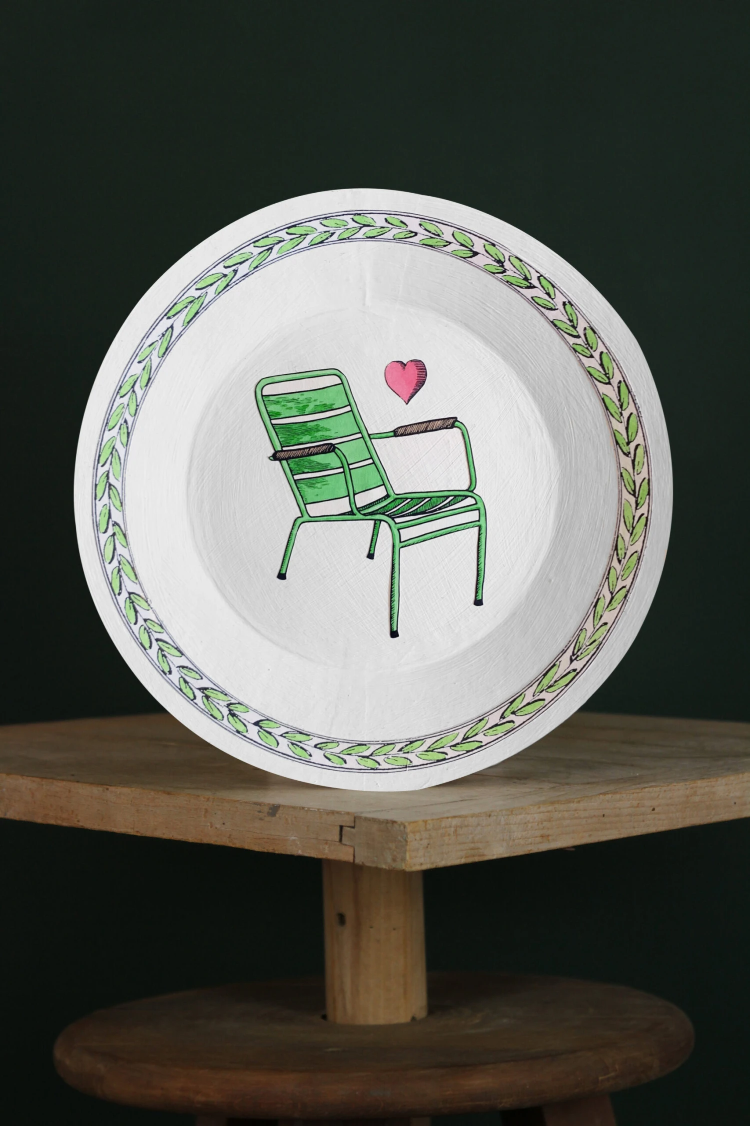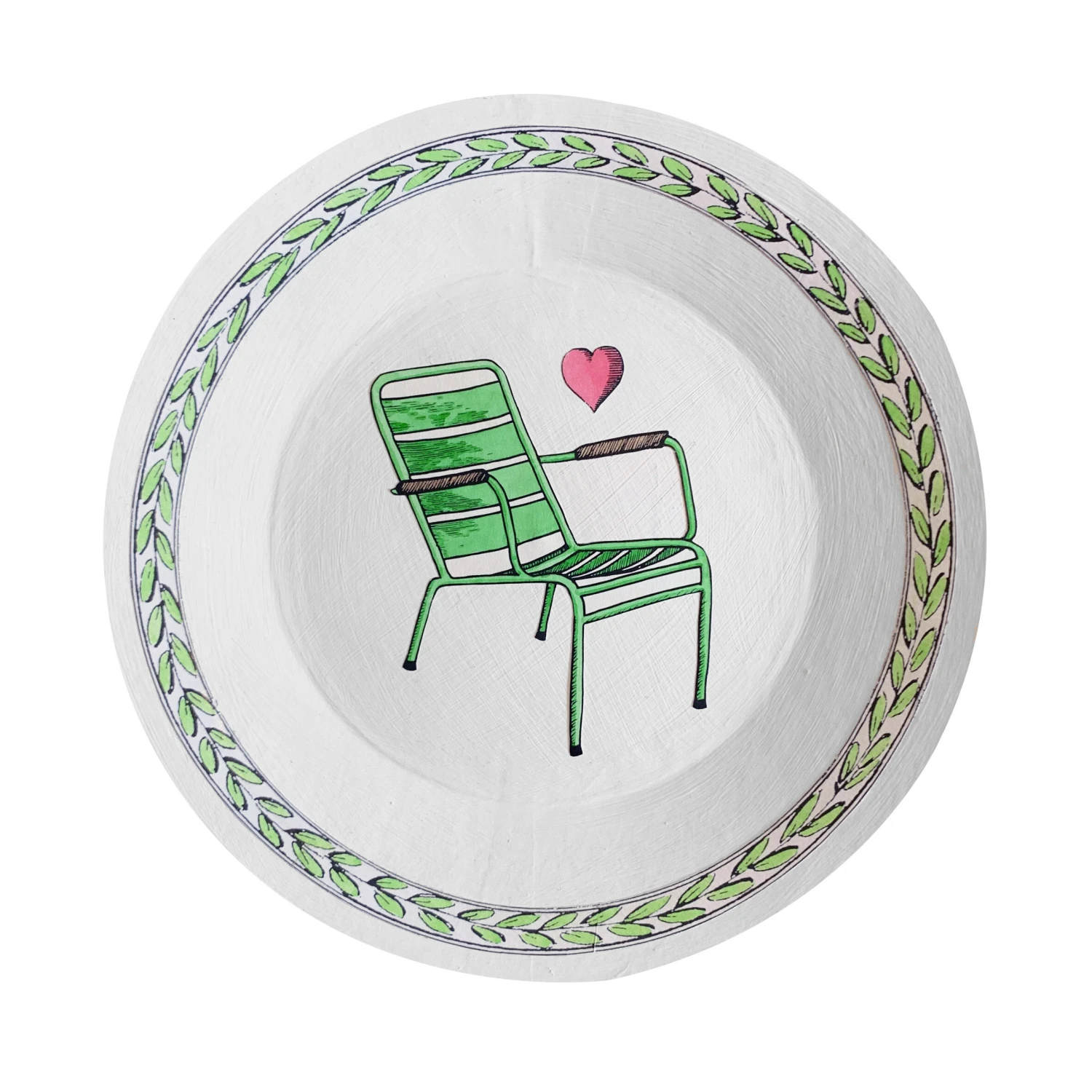 Créé en 1612 à la demande de Marie de Médicis, le Jardin du Luxembourg est l’un des rendez-vous printanier des amoureux de Paris. Marin Montagut le croque par l’un de ses accessoires les plus illustres : son emblématique chaise verte, la CHAISE DU LUXEMBOURG. L’illustration est déclinée ici en assiette décorative en papier mâché.