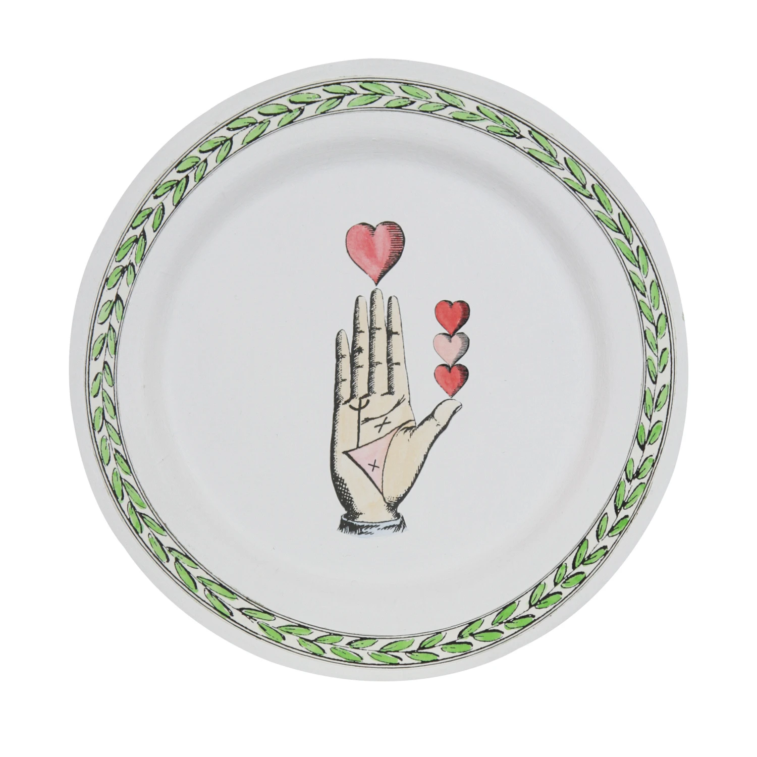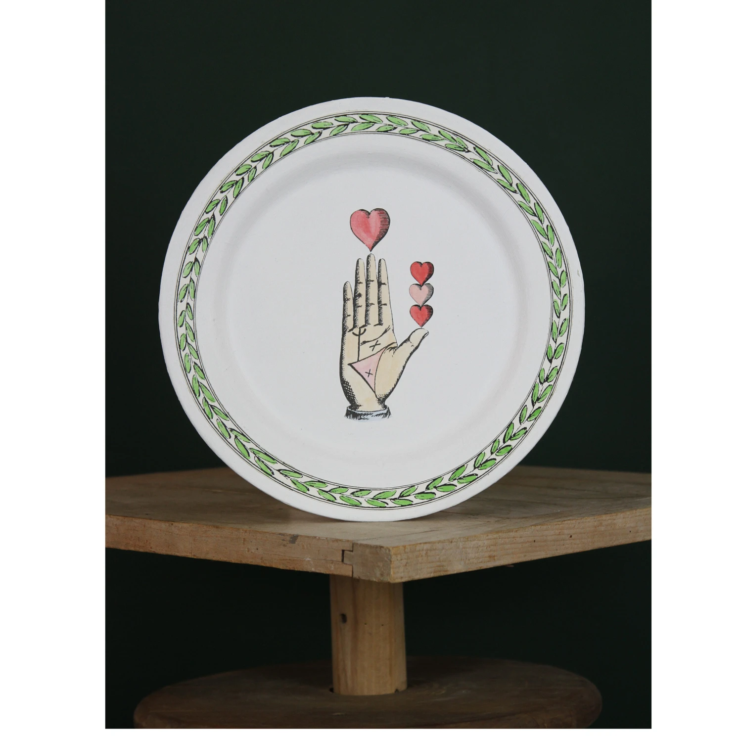 Inspiré de la symbolique mystérieuse et poétique du tarot, l’illustration à l’aquarelle COEUR SUR LA MAIN de Marin Montagut est déclinée ici en assiette décorative en papier mâché.