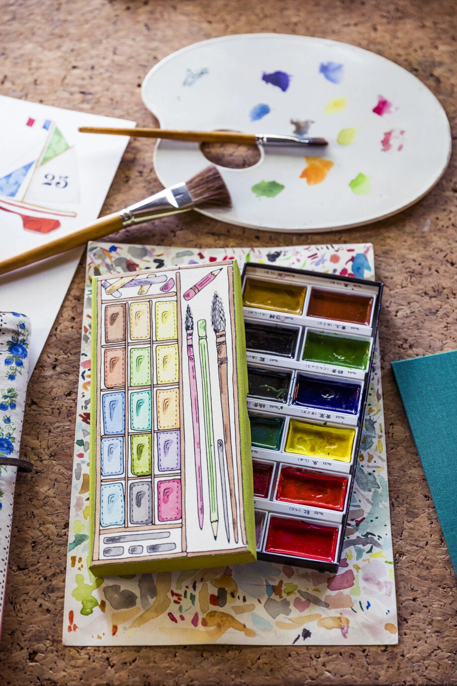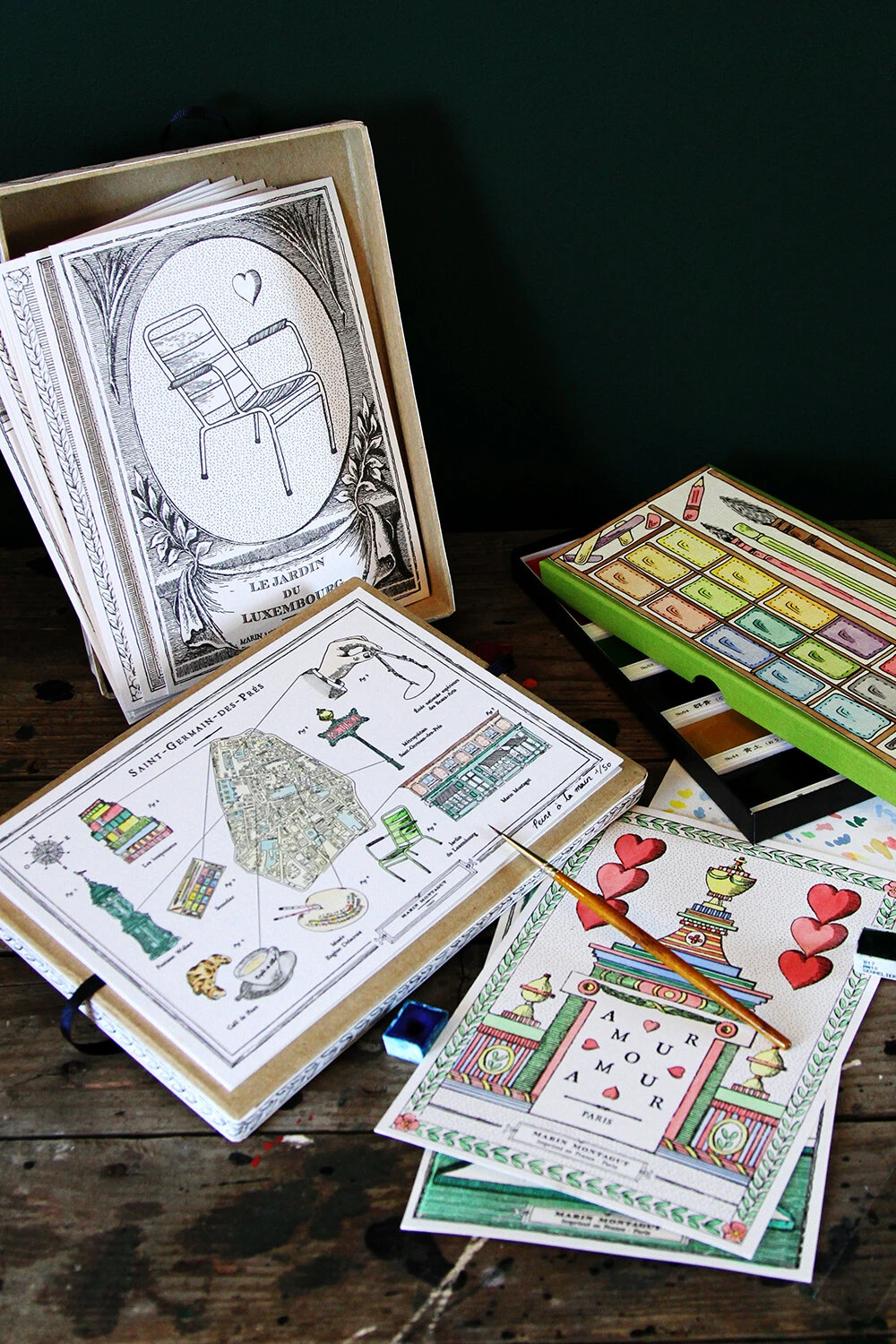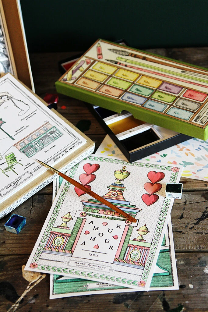 Retrouvez la palette d’aquarelle personnalisée par Marin Montagut dans son écrin fait à Paris.