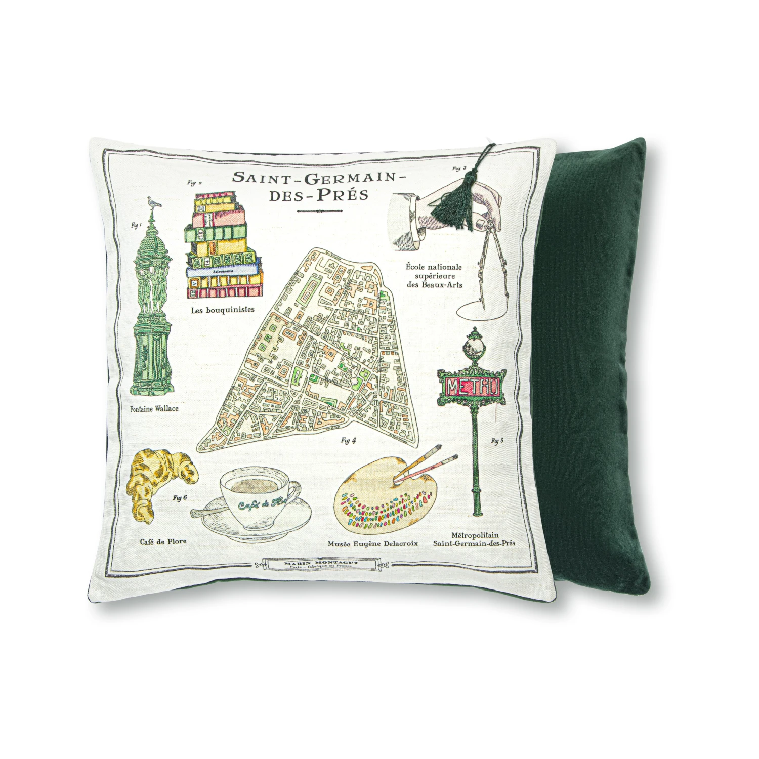 Grand amoureux de Paris et de ses ruelles féériques, Marin Montagut a voulu immortaliser de son trait ses trois quartiers de prédilection : Le Marais, Montmartre et Saint Germain des Prés. L’illustration SAINT GERMAIN DES PRÉS créée par Marin Montagut est déclinée ici en un coussin de lin et coton.
