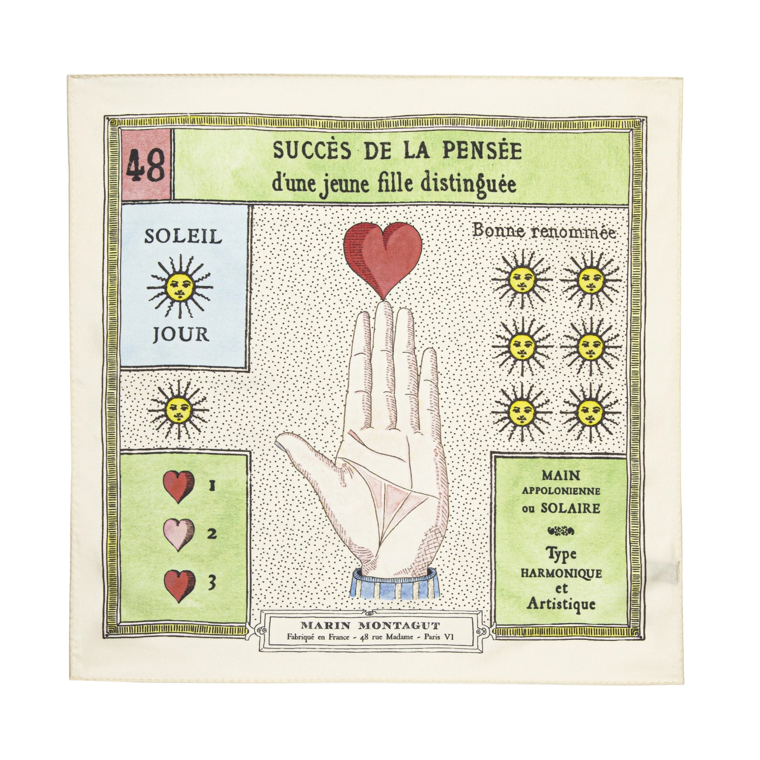 Inspiré de la symbolique mystérieuse et poétique du tarot, l’illustration à l’aquarelle COEUR SUR LA MAIN de Marin Montagut est déclinée ici en carré de soie, délicatement confectionné par une manufacture familiale à Lyon en France. Il existe en deux tailles différentes, les deux permettant au foulard d’être porté autour du cou.