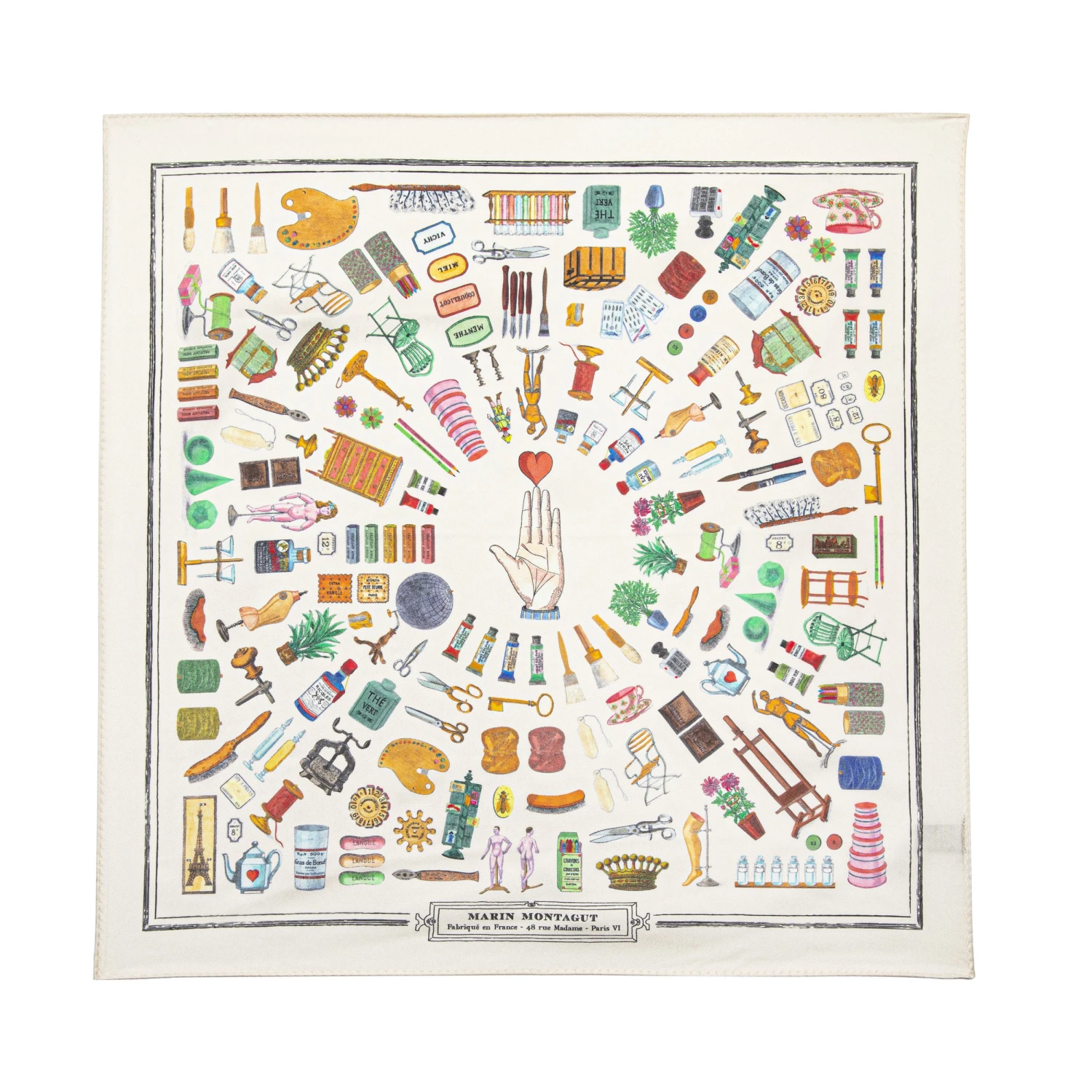 Ce carré de soie décoré avec les aquarelles de Marin est un véritable clin d’œil à son dernier livre, le Paris Merveilleux. Laissez vous emporter par les couleurs et les objets de ce carré qui représentent des échoppes et ateliers d’antan chers à l’artiste. Voyagez dans le Paris d’Antan de Marin Montagut !