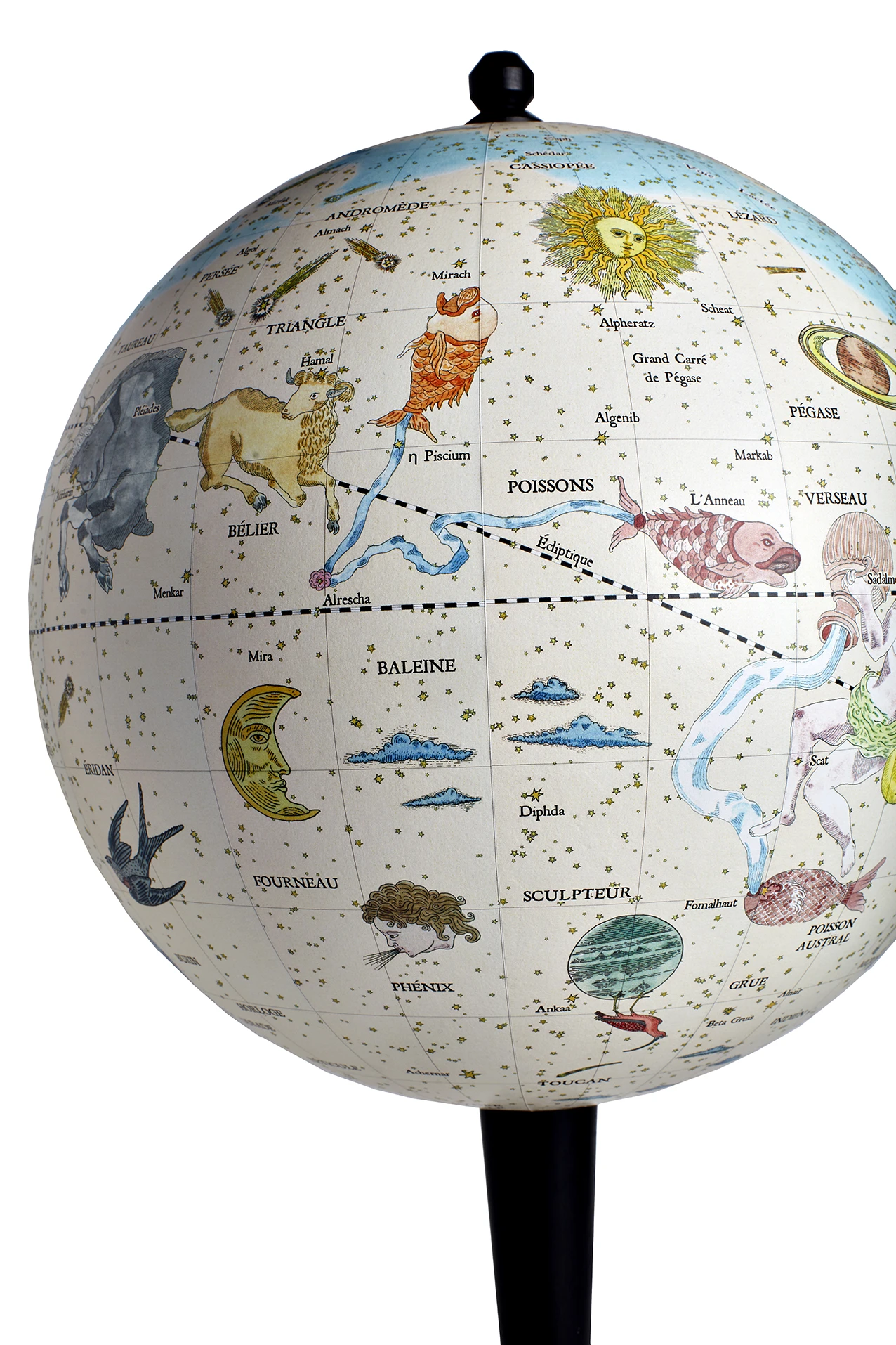 Né d’une collaboration de Marin Montagut avec un cartographe, le globe ASTRALE est issu d’un savoir-faire artisanal d’exception qui exige une semaine de travail à la main pour sa création. La structure du globe est en carton fixé à la colle de farine et enduite d’une fine couche de plâtre. Le calcul des douze fuseaux cartographiques est à jour et réalisé au millimètre près. Le socle en bois est tourné à la main et enduit d’une peinture noir mat.