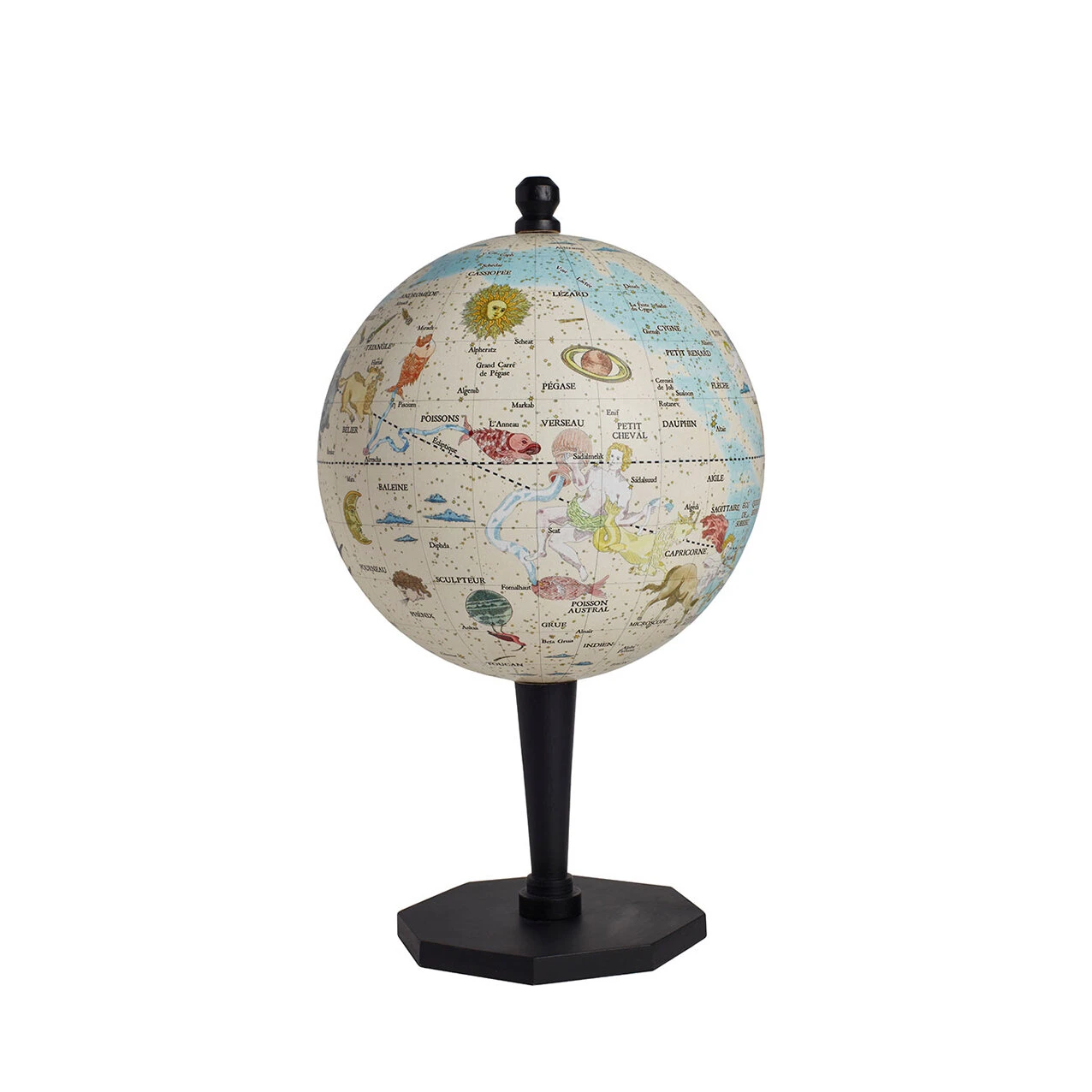 Né d’une collaboration de Marin Montagut avec un cartographe, le globe ASTRALE est issu d’un savoir-faire artisanal d’exception qui exige une semaine de travail à la main pour sa création. La structure du globe est en carton fixé à la colle de farine et enduite d’une fine couche de plâtre. Le calcul des douze fuseaux cartographiques est à jour et réalisé au millimètre près. Le socle en bois est tourné à la main et enduit d’une peinture noir mat.