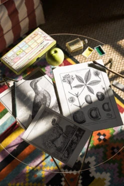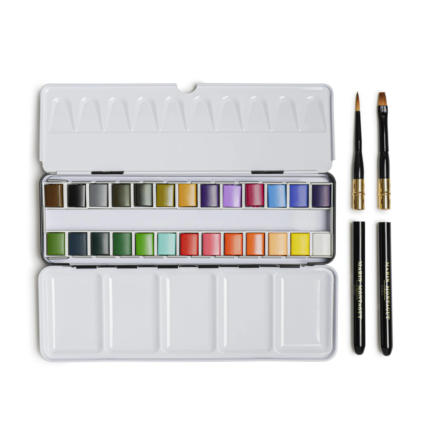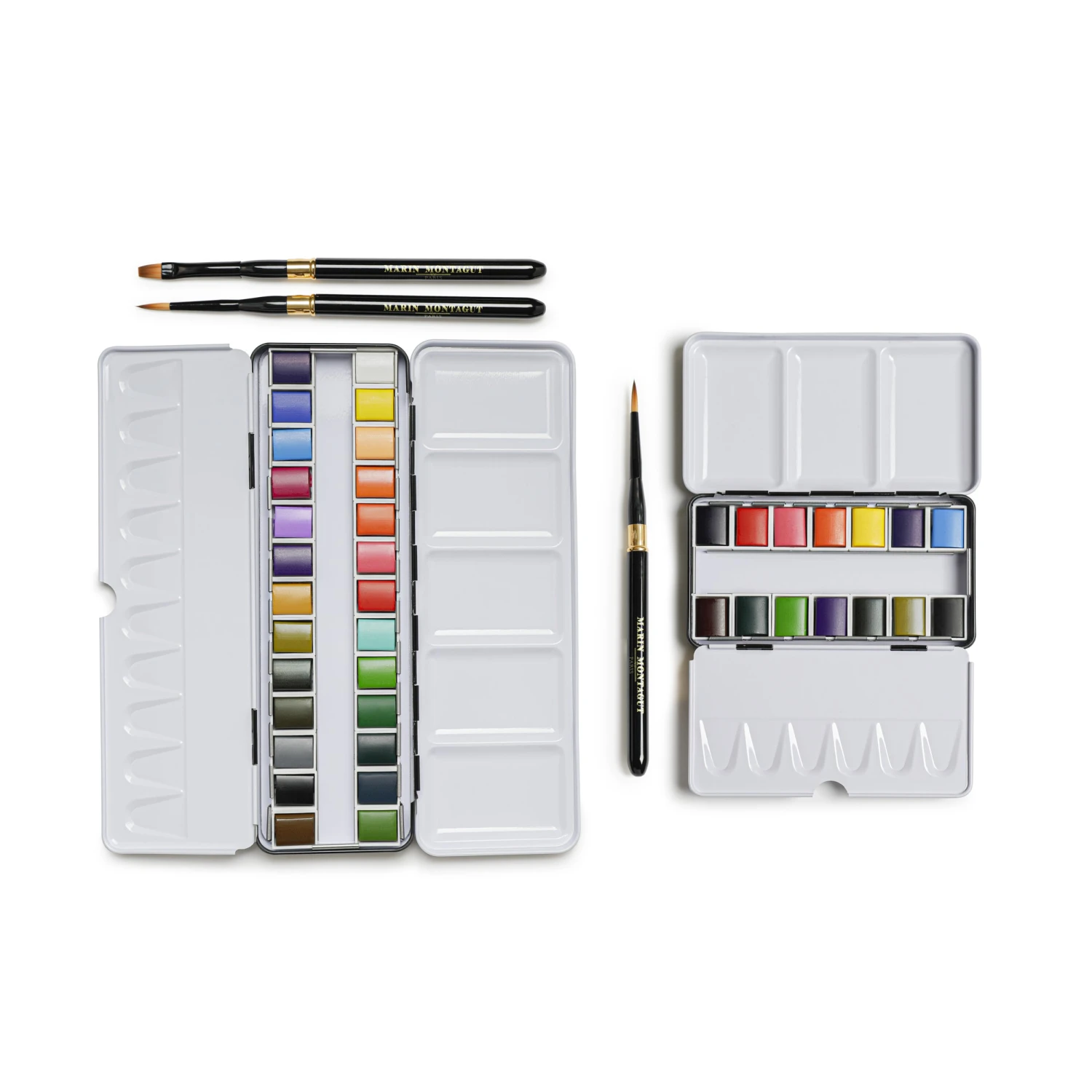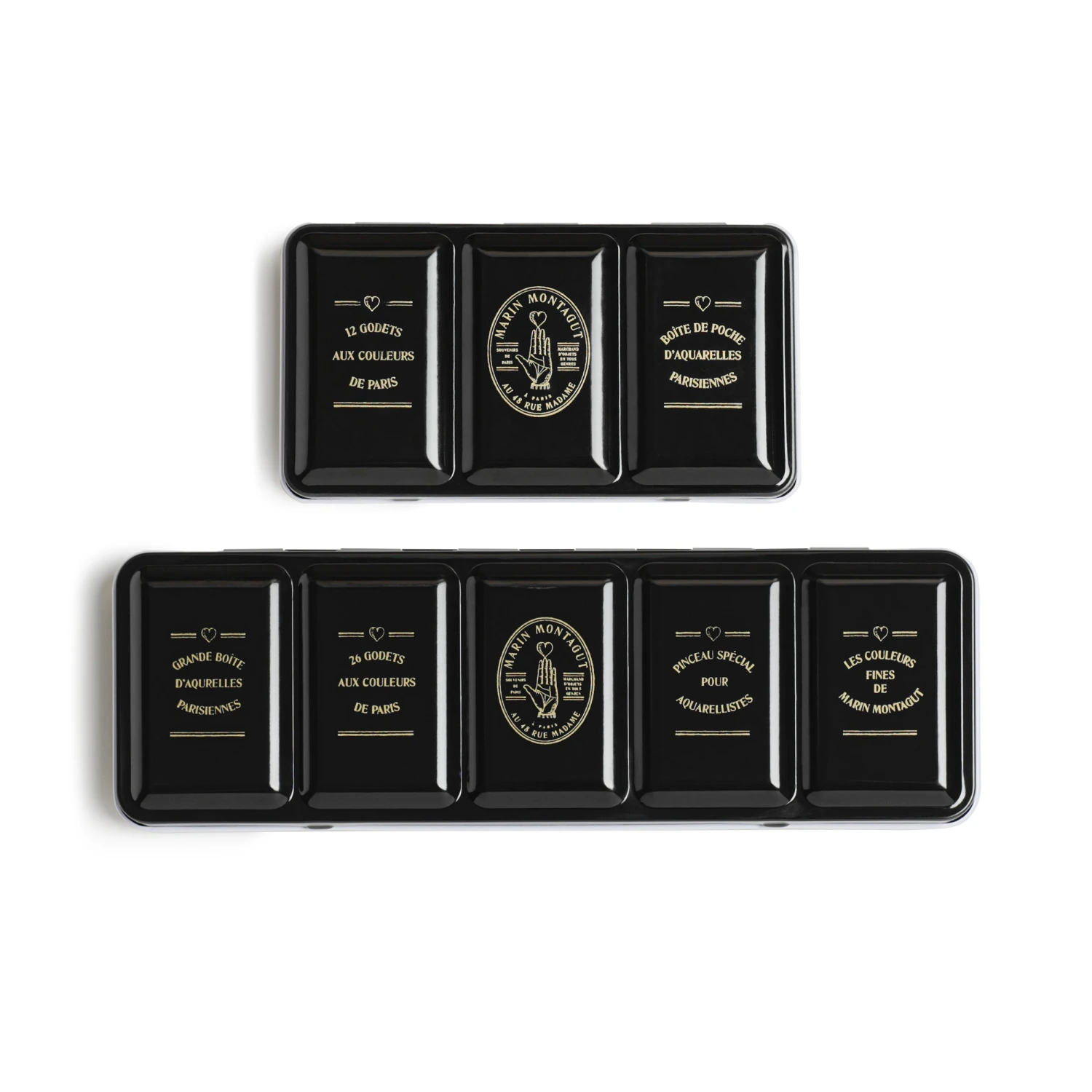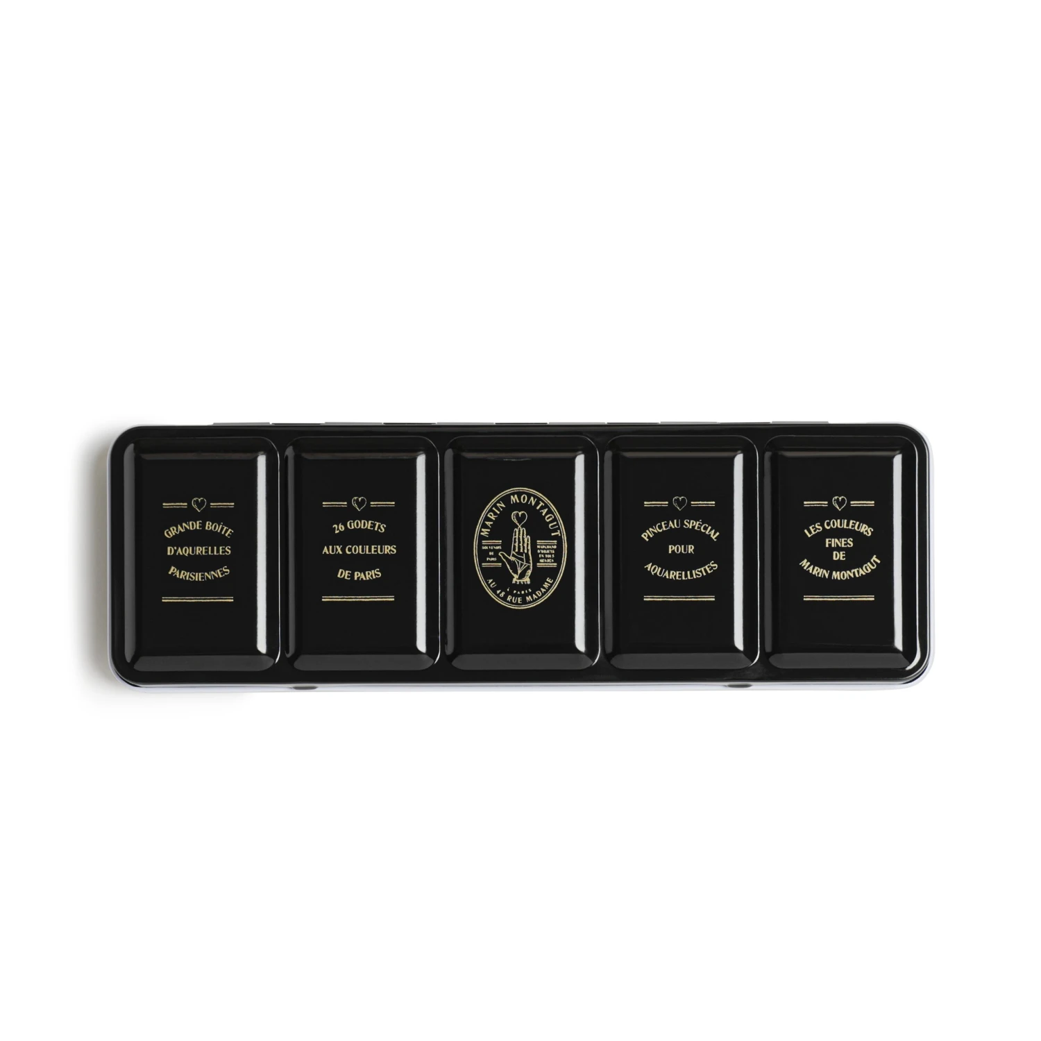 Cette palette est un véritable écrin de 26 godets d’aquarelle, comprenant deux pinceaux personnalisés Marin Montagut.