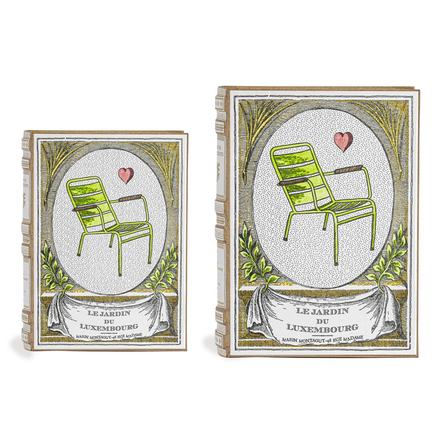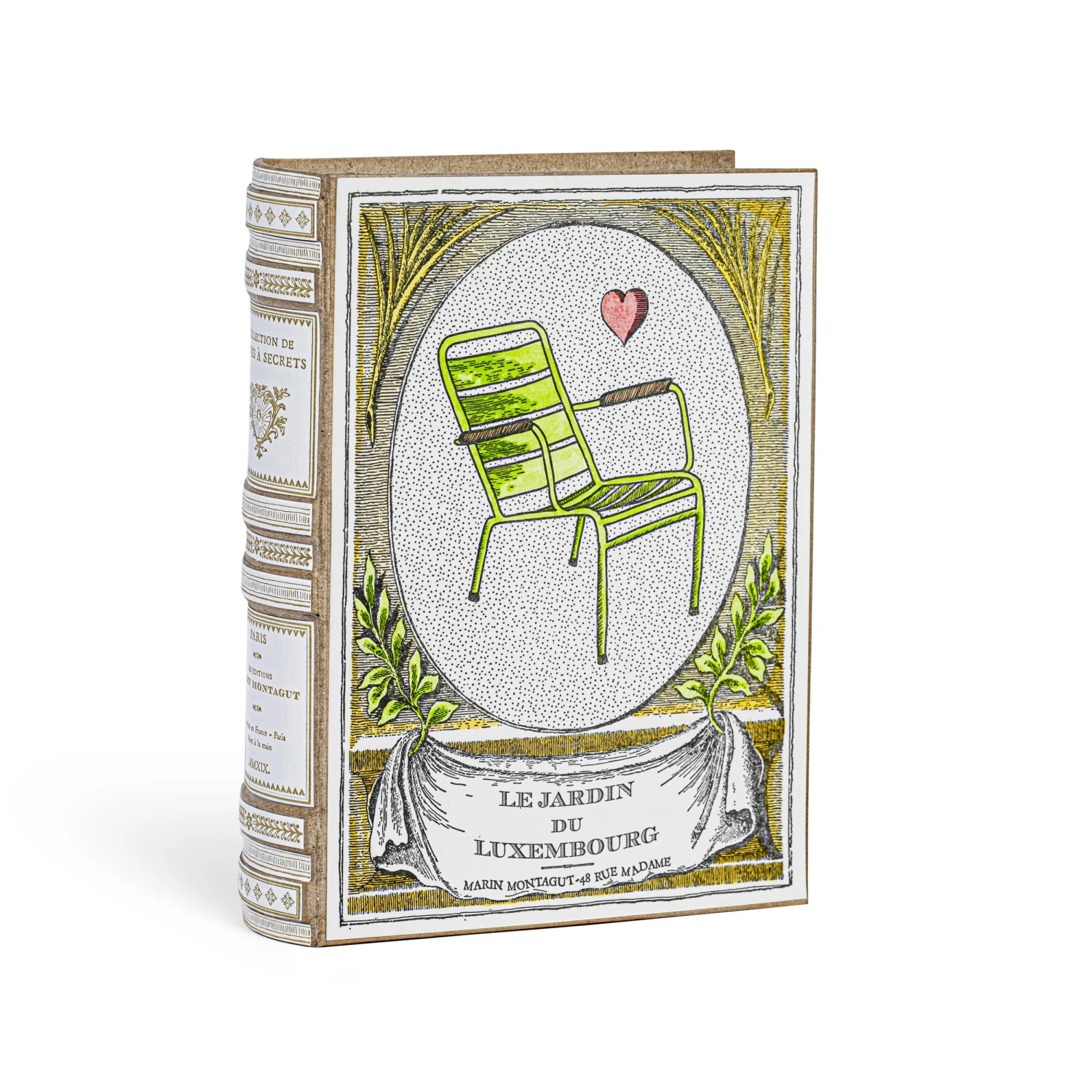 Créé en 1612 à la demande de Marie de Médicis, le Jardin du Luxembourg est l’un des rendez-vous printanier des amoureux de Paris. Marin Montagut le croque par l’un de ses accessoires les plus illustres : son emblématique chaise verte, la “CHAISE DU LUXEMBOURG”. L’illustration à l’aquarelle est déclinée ici sous la forme d’un Livre À Secrets.