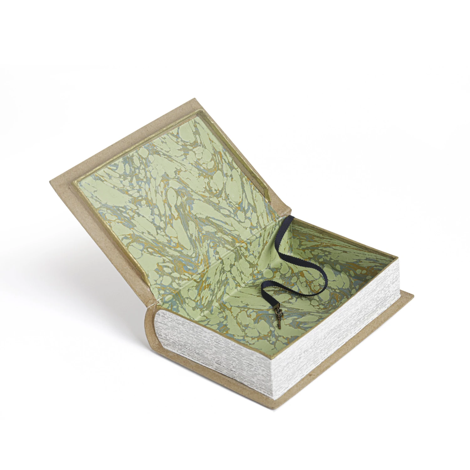 Inspirée de cette tradition, la collection “Livres À Secrets” créée en papier mâché est entièrement confectionnée, peinte et numérotée à la main dans les ateliers de Marin Montagut à Paris. L’intérieur est revêtu d’un papier marbré de reliure imprimé à la main en France et contient un ruban avec à son bout un colifichet en métal en forme de clé.