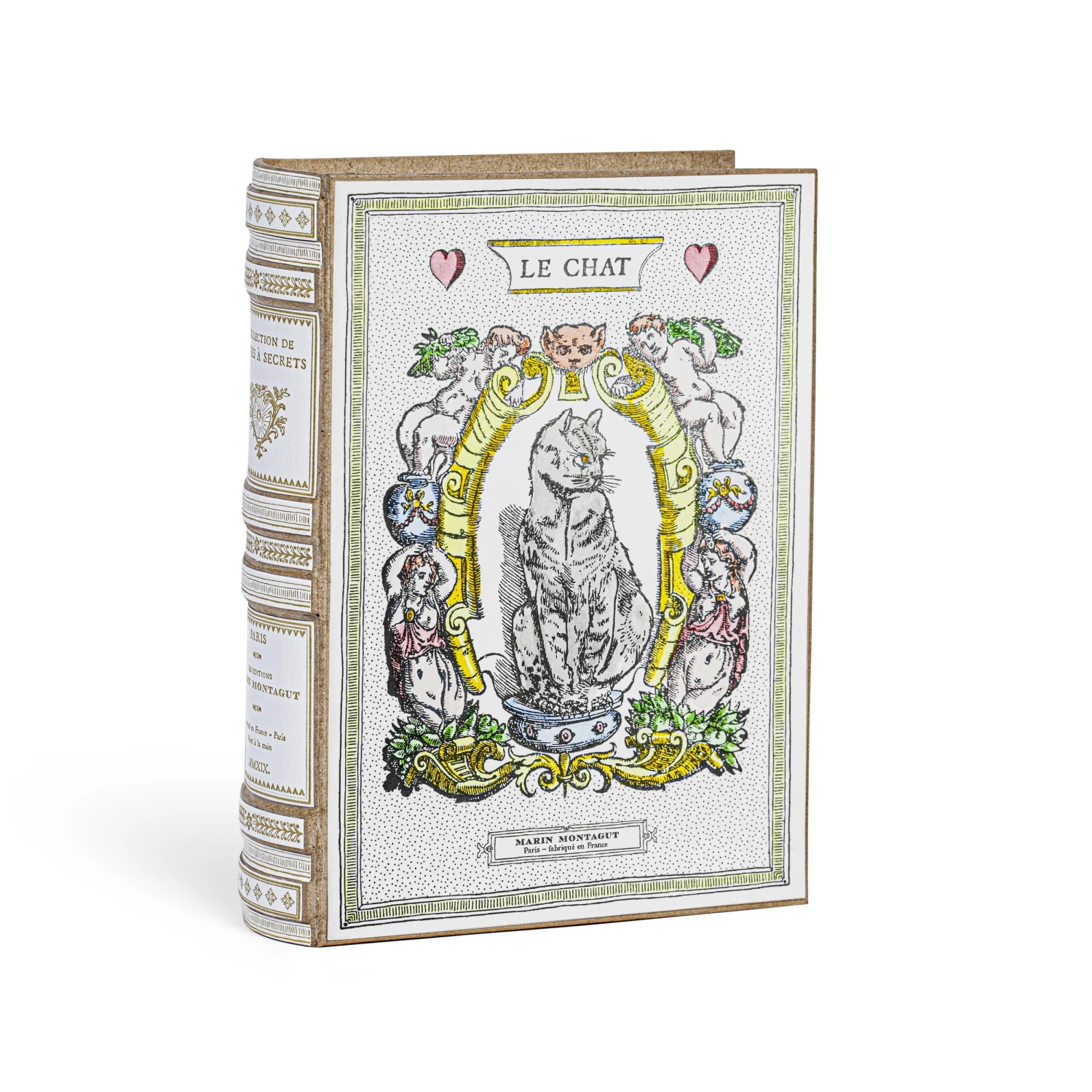 Ôde au maître de nos coeurs et de nos chaumières, LE CHAT MÉDAILLON est dédié aux amoureux de ces petits félins. L’illustration créée par Marin Montagut est déclinée ici sous la forme d’un Livre À Secrets.