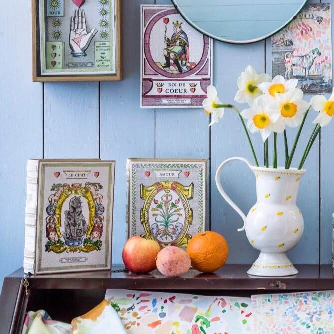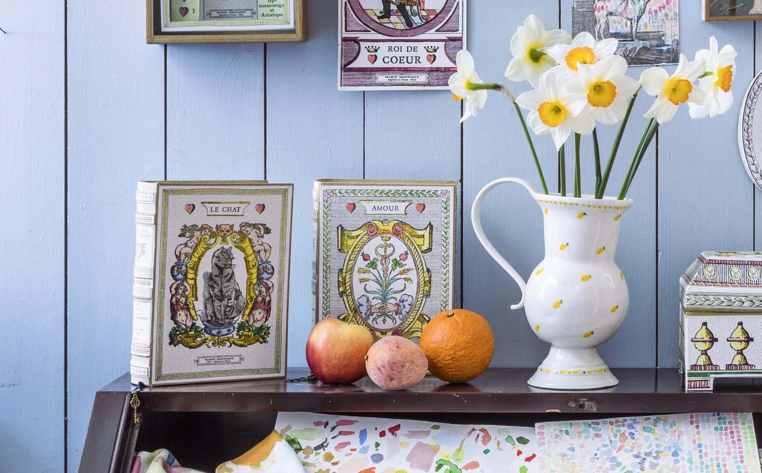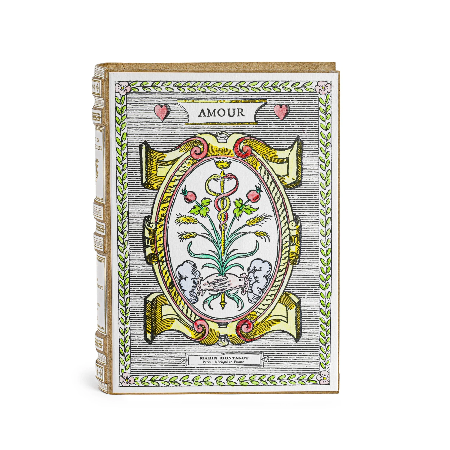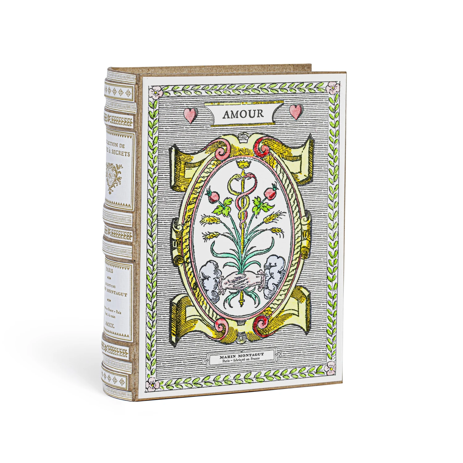 Inspirée de cette tradition, la collection “Livres À Secrets” créée en papier mâché est entièrement confectionnée, peinte et numérotée à la main dans les ateliers de Marin Montagut à Paris. L’intérieur est revêtu d’un papier marbré de reliure imprimé à la main en France et contient un ruban avec à son bout un colifichet en métal en forme de clé.