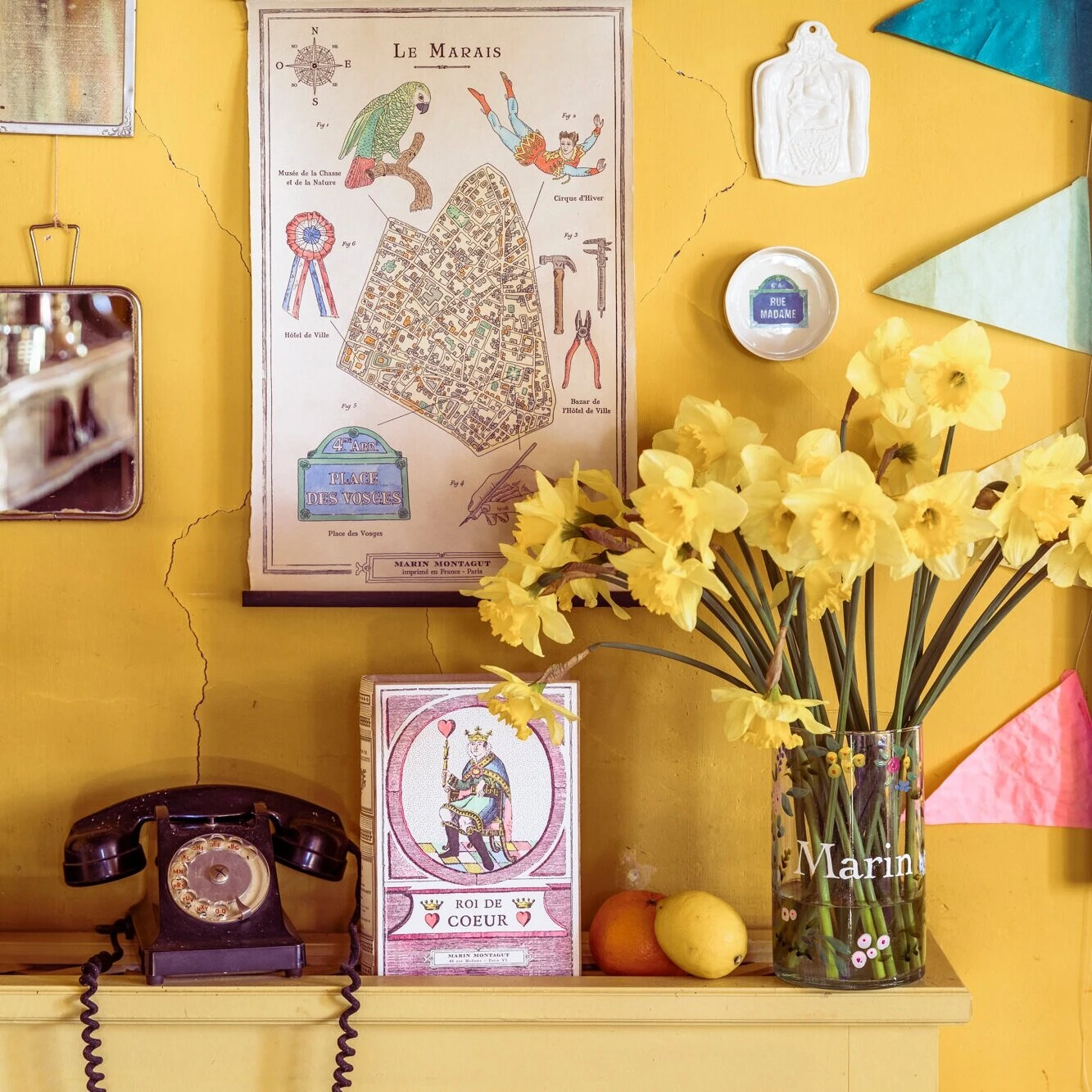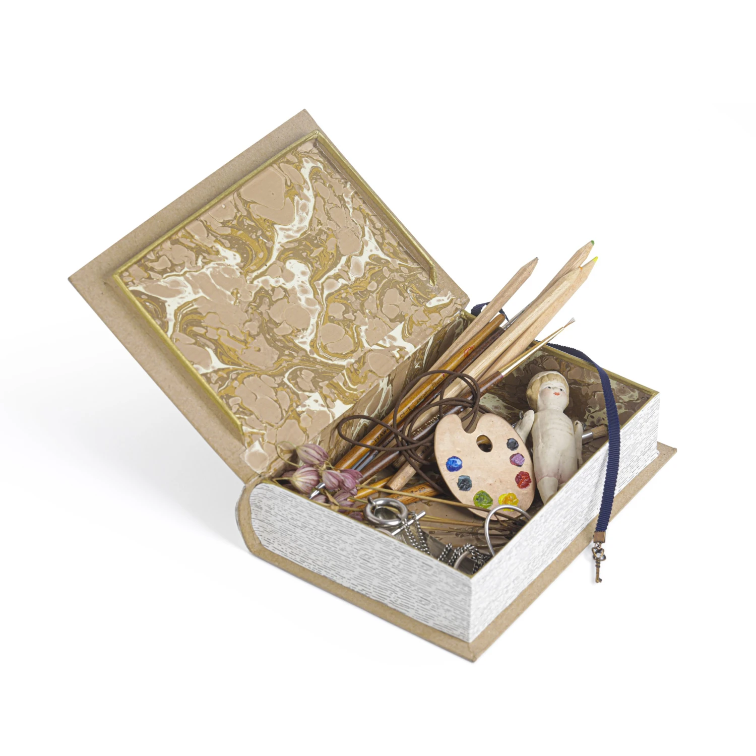 Inspirée de cette tradition, la collection “Livres À Secrets” créée en papier mâché est entièrement confectionnée, peinte et numérotée à la main dans les ateliers de Marin Montagut à Paris. L’intérieur est revêtu d’un papier marbré de reliure imprimé à la main en France et contient un ruban avec à son bout un colifichet en métal en forme de clé.