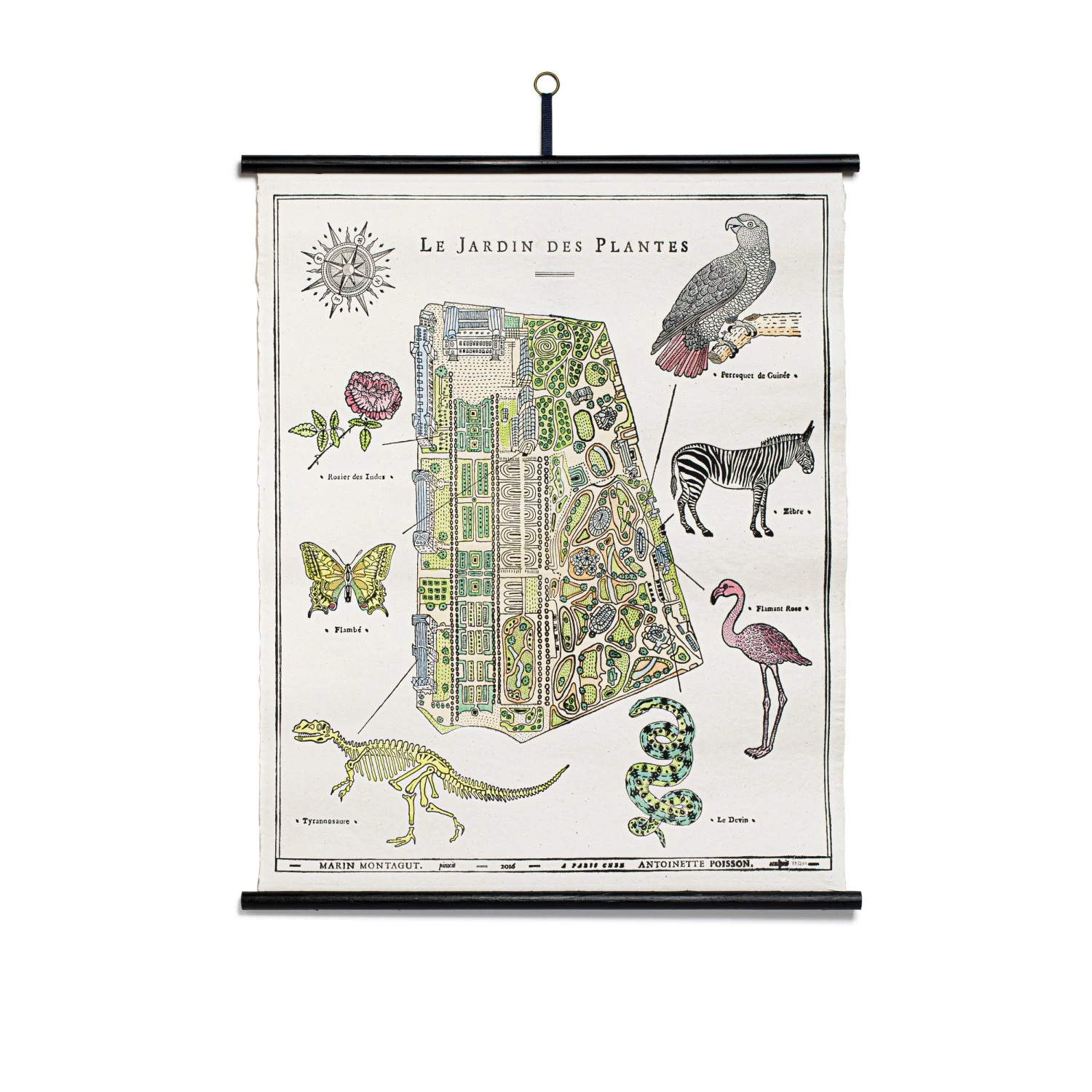 La Révolution emportant la tête du Roi, le JARDIN DU ROI fut renommé LE JARDIN DES PLANTES en 1793. Il est le seul jardin dont l’ouverture au public est réglée par la nature : ouvert du lever au coucher du soleil, ses horaires fluctuent tout au long de l’année. Marin Montagut le croque en vue aérienne et accompagné de ses habitants les plus illustres, tels que ses flamands roses, ses dinosaures et ses belles fleurs. L’illustration à l’aquarelle est déclinée ici en planche murale.