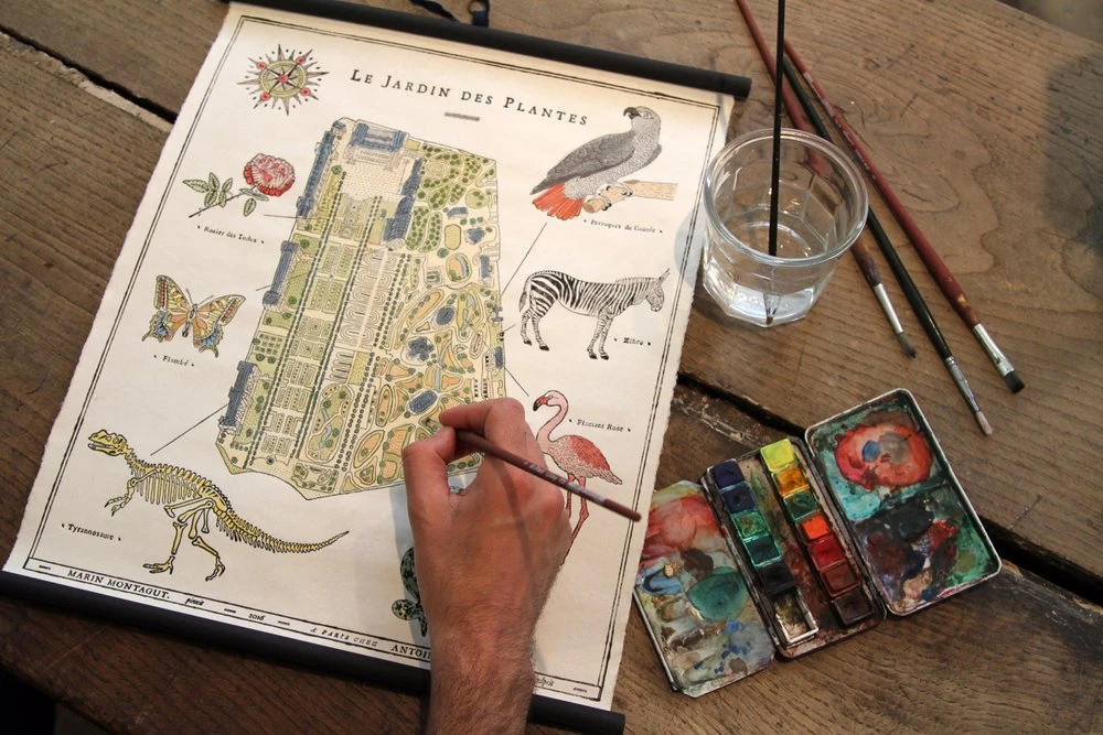 La planche murale décorative a été réalisée en collaboration : elle a été dessinée à la main par Marin Montagut puis imprimée par Antoinette Poisson. Marin a réalisé lui même les dessins originaux tout en respectant l’esprit des gravures du XVIIIème siècle. Fidèle à la qualité des matériaux utilisés à l’époque, « À Paris chez Antoinette Poisson » a ensuite pressé feuille à feuille ses illustrations dans leur atelier parisien, à la presse à la façon, sur du papier dominoté artisanal vergé 100% pur chiffon fabriqué à la main en France. Enfin, Marin a fixé chaque gravure sur deux baguettes en bois qui s’enroule sur elle-même tel un parchemin et se referme à l’aide d’un ruban gros grain à la manière des cartes manuscrites de l’époque.