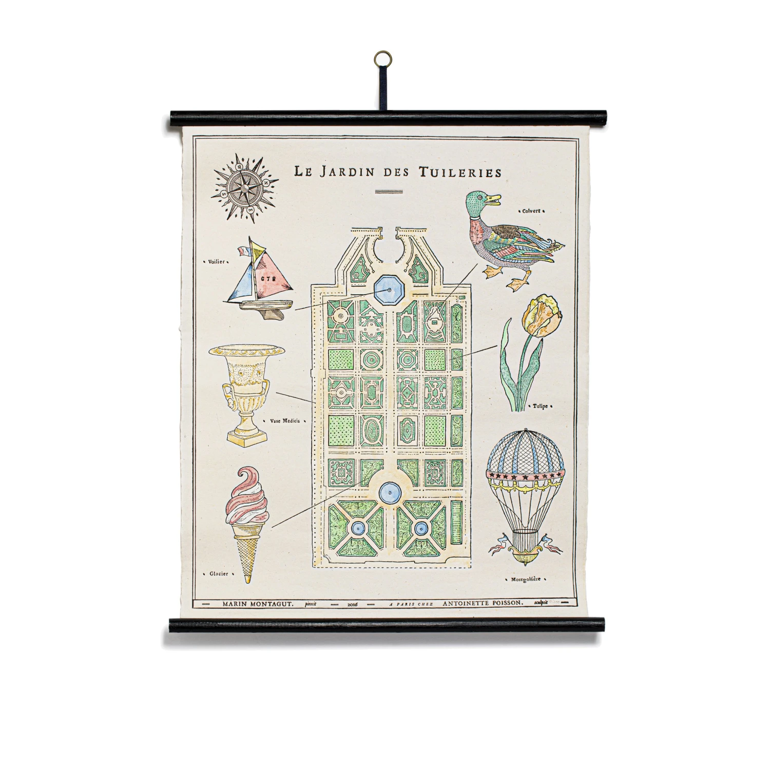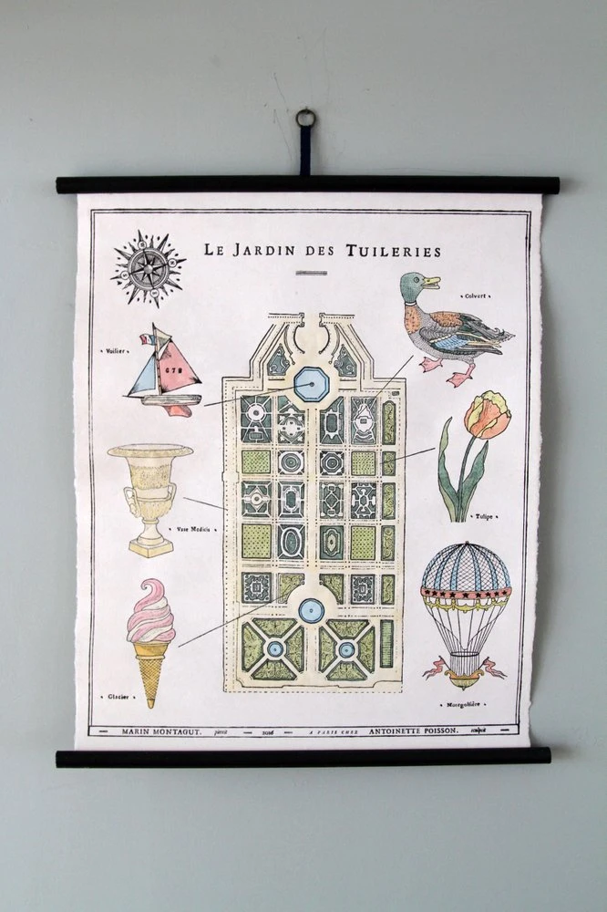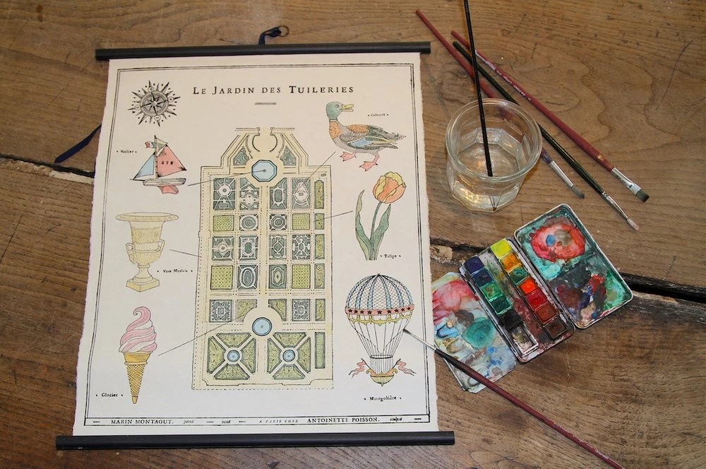 Créé au XVIème siècle, sur un ancien terrain de fabrication artisanale de tuiles, LE JARDIN DES TUILERIES est le plus important et le plus ancien jardin à la française de la ville des lumières. Marin Montagut le croque en vue aérienne et accompagné de ses accessoires les plus illustres, tels que ses petits bateaux, ses canards et ses montgolfières. L’illustration à l’aquarelle est déclinée ici en planche murale.