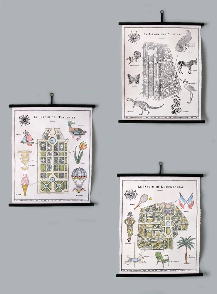 La planche murale décorative a été réalisée en collaboration : elle a été dessinée à la main par Marin Montagut puis imprimée par Antoinette Poisson. Marin a réalisé lui même les dessins originaux tout en respectant l’esprit des gravures du XVIIIème siècle. Fidèle à la qualité des matériaux utilisés à l’époque, « À Paris chez Antoinette Poisson » a ensuite pressé feuille à feuille ses illustrations dans leur atelier parisien, à la presse à la façon, sur du papier dominoté artisanal vergé 100% pur chiffon fabriqué à la main en France. Enfin, Marin a fixé chaque gravure sur deux baguettes en bois qui s’enroule sur elle-même tel un parchemin et se referme à l’aide d’un ruban gros grain à la manière des cartes manuscrites de l’époque.
