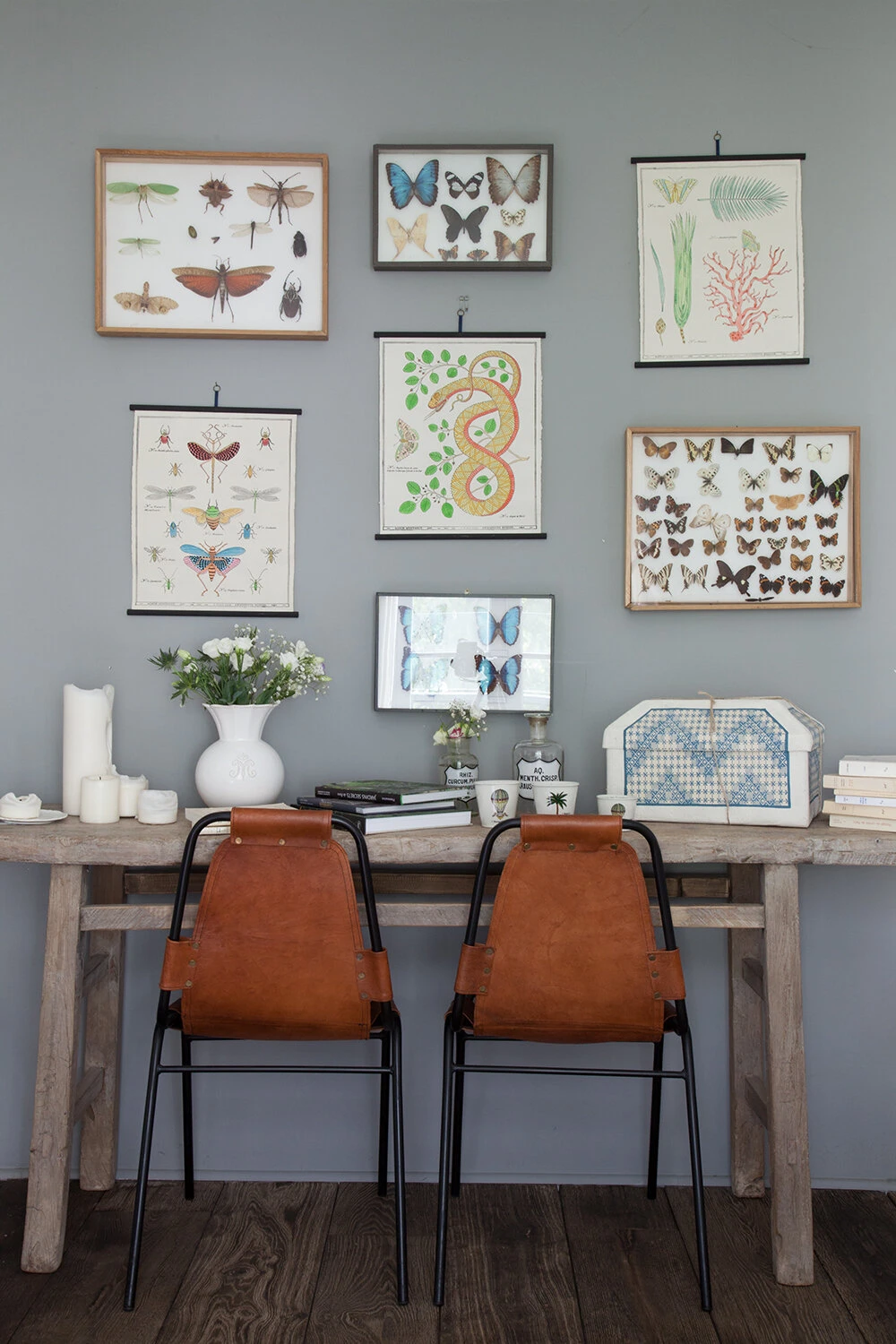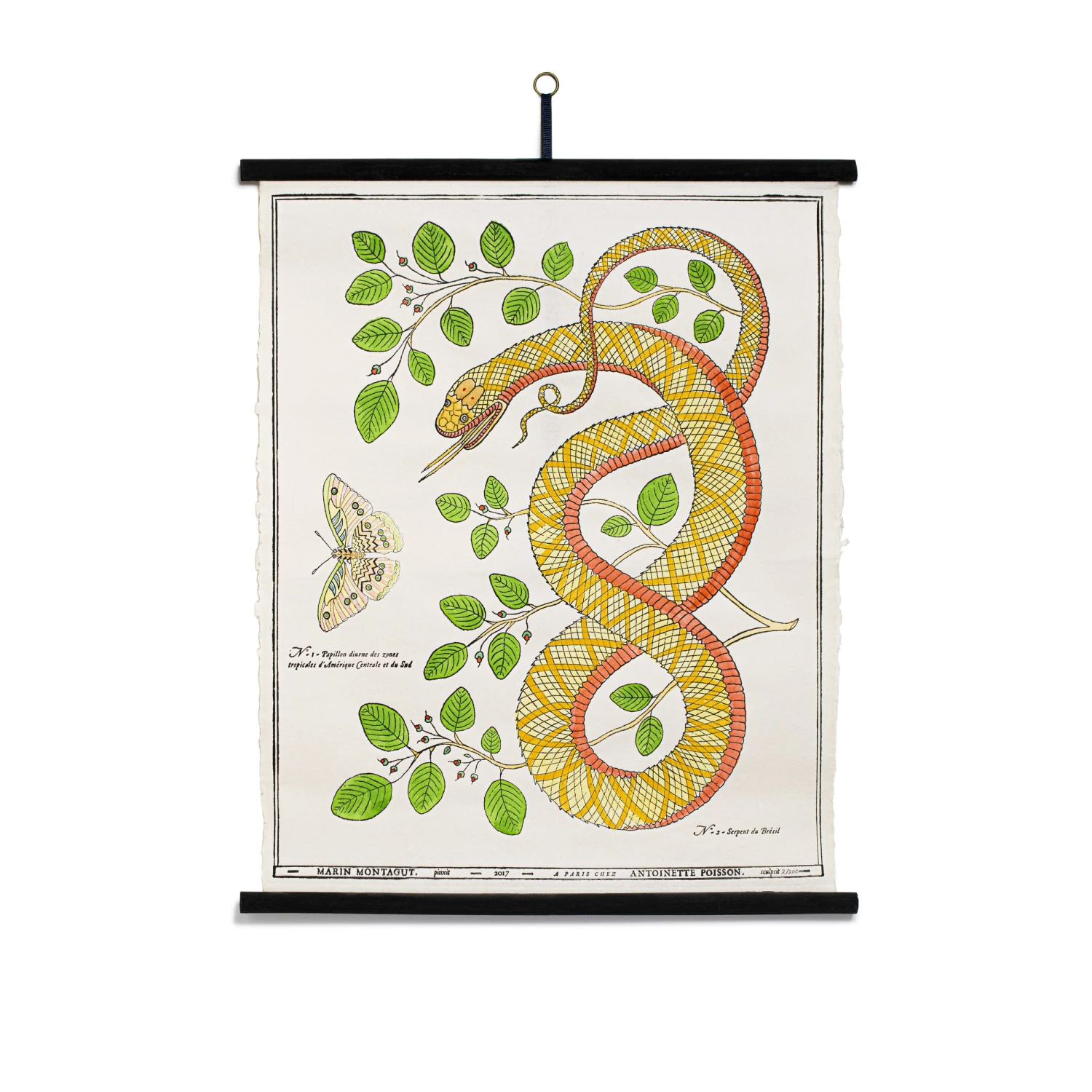 La planche murale décorative LE SERPENT & LE PAPILLON a été réalisée en collaboration : elle a été dessinée à la main par Marin Montagut puis imprimée par Antoinette Poisson. Marin a réalisé lui même les dessins originaux tout en respectant l’esprit des gravures du XVIIIème siècle. Fidèle à la qualité des matériaux utilisés à l’époque, « À Paris chez Antoinette Poisson » a ensuite pressé feuille à feuille ses illustrations dans leur atelier parisien, à la presse à la façon, sur du papier dominoté artisanal vergé 100% pur chiffon fabriqué à la main en France. Enfin, Marin a fixé chaque gravure sur deux baguettes en bois qui s’enroule sur elle-même tel un parchemin et se referme à l’aide d’un ruban gros grain à la manière des cartes manuscrites de l’époque.