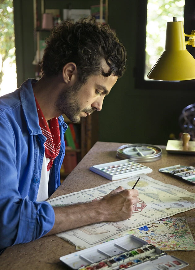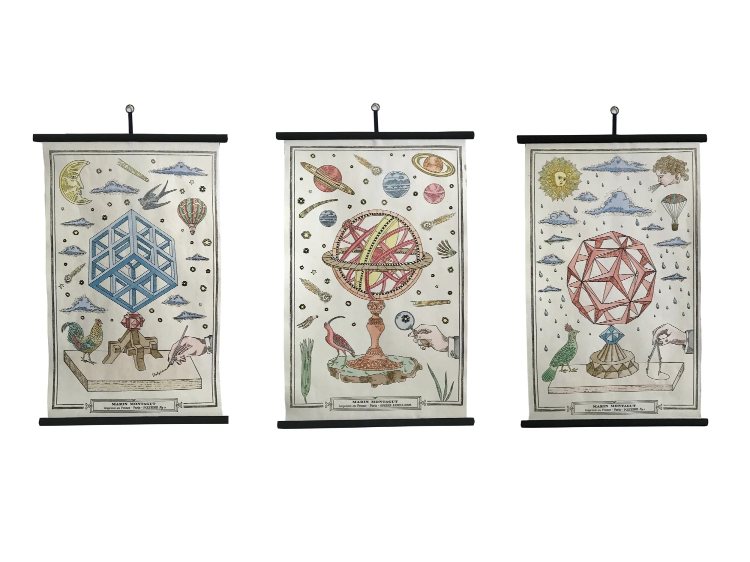 Fasciné par les astres au milieu desquels la Terre navigue, Marin Montagut nous offre deux illustrations de formes géométriques représentant des abstractions célestes : la SPHÈRE ARMILLAIRE et le POLYÈDRE, en deux déclinaisons bleue et rouge.