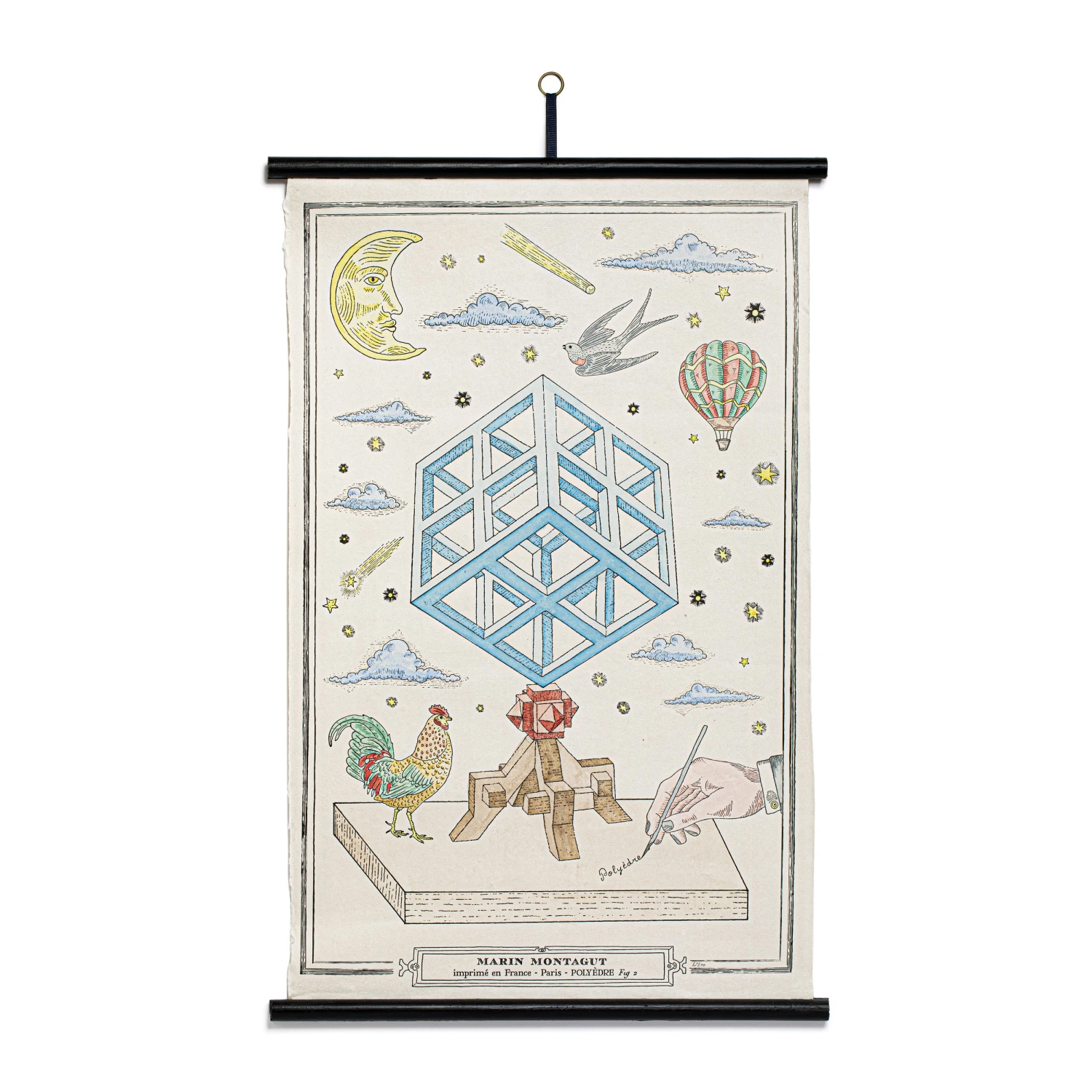 La planche murale décorative POLYÈDRE BLEU est imprimée sur presse à Paris, sur un papier chiffon confectionné à la main dans un moulin du sud de la France selon les techniques du 18ème siècle. L’impression est ensuite mise en couleur à l’aquarelle à Montmartre.