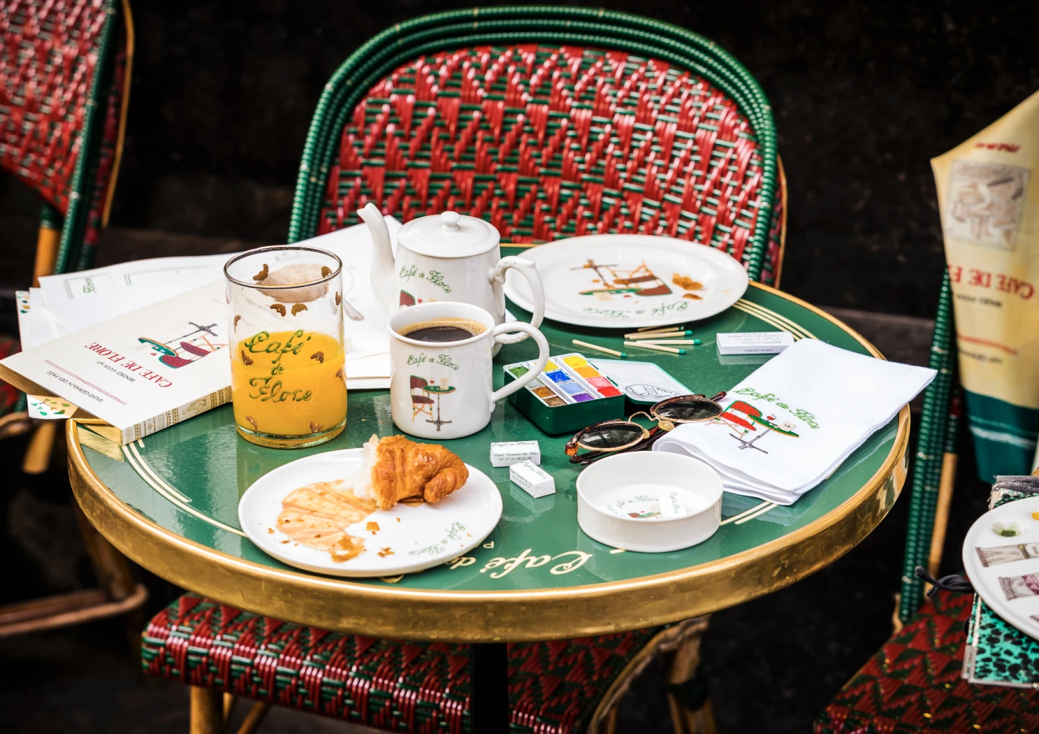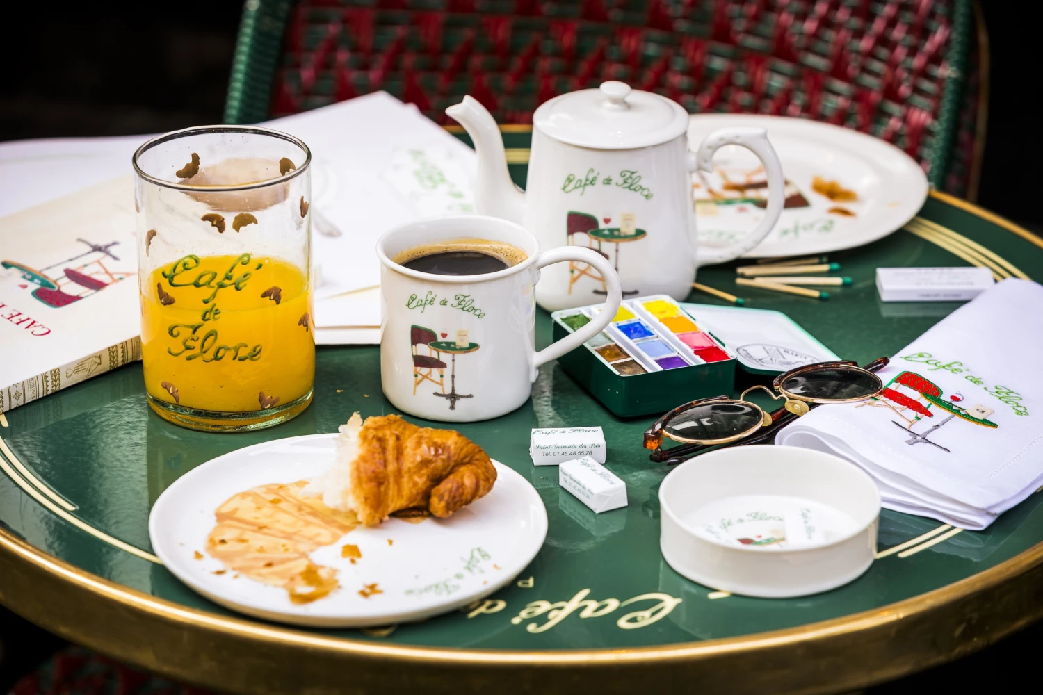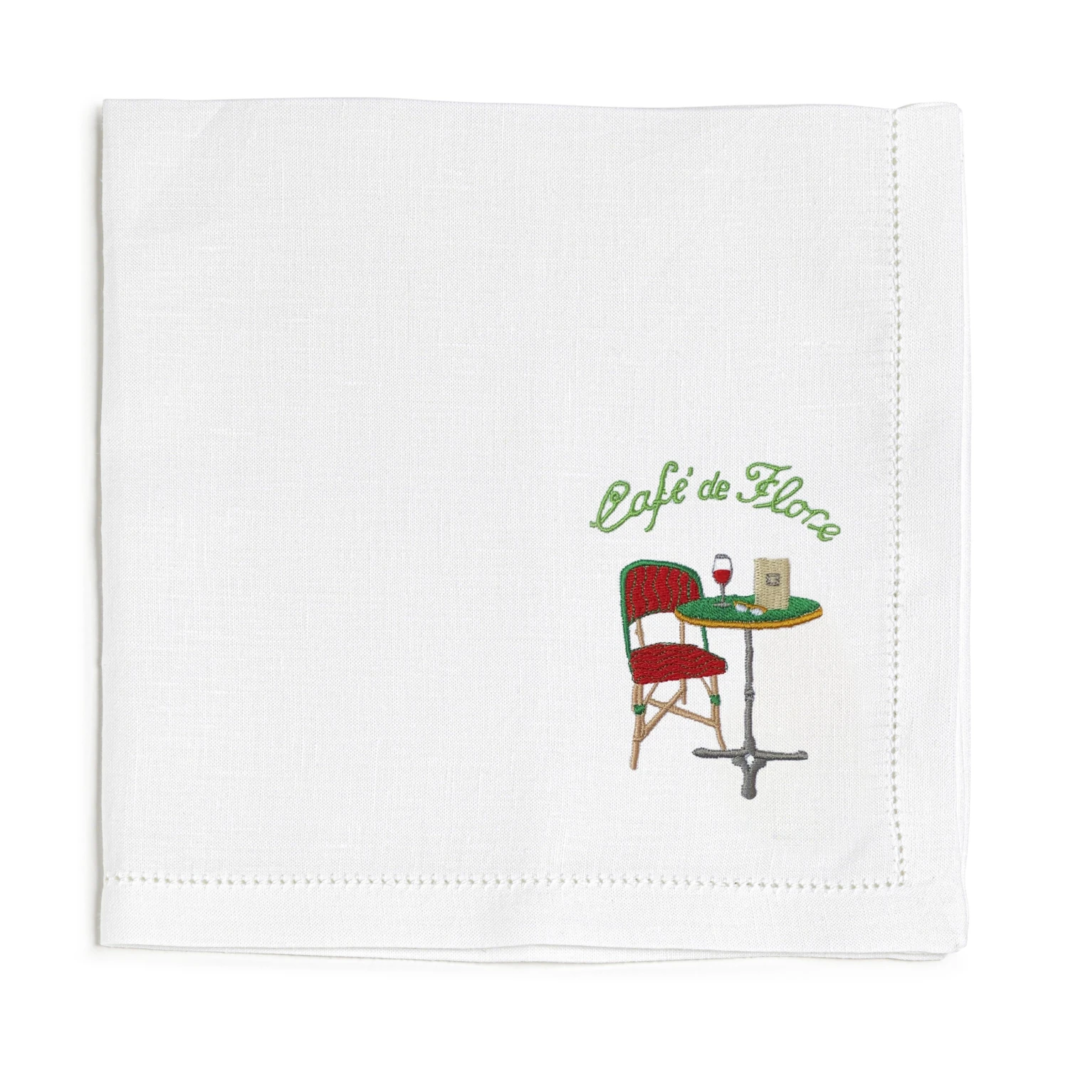 Pour cette serviette en lin brodée, Marin Montagut a réinterprété à travers ses aquarelles les iconiques du Café de Flore tels que le guéridon et la chaise de bistrot.