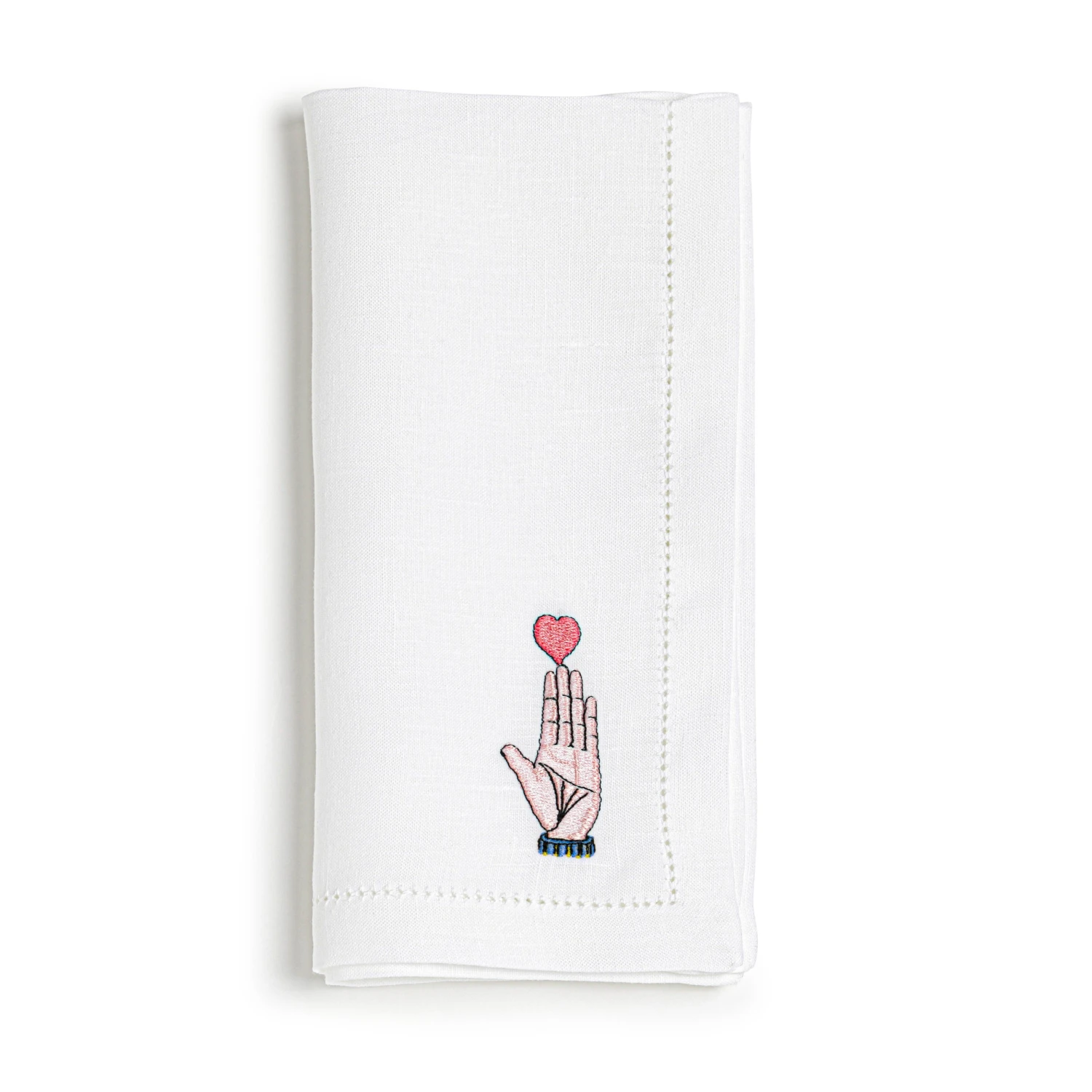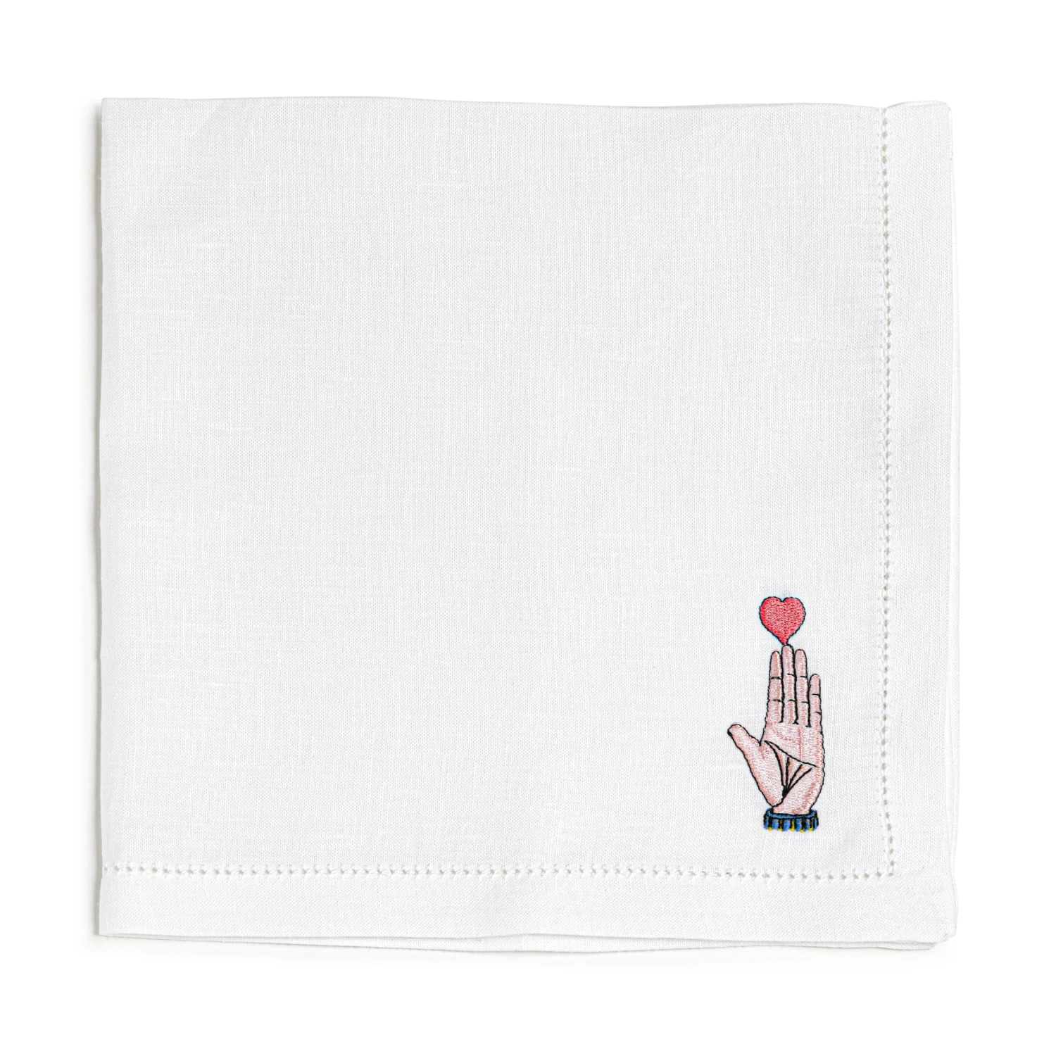 Pour cette serviette en lin brodée, Marin Montagut a utilisé le coeur sur la main, aquarelle iconique Marin Montagut.