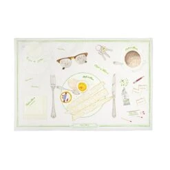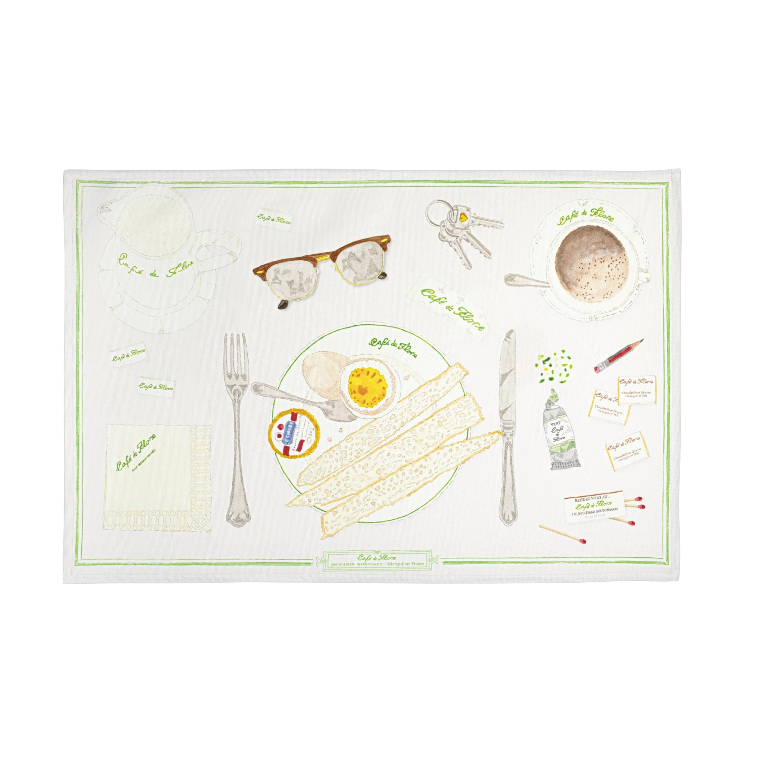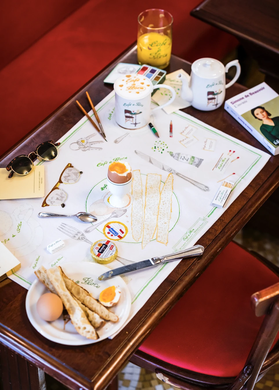 Pour ce set de table travaillé en véritable trompe-l’œil, Marin Montagut s’est inspiré de ses petits-déjeuners au Café de Flore en peignant à l’aquarelle les incontournables œufs à la coque, ses mouillettes et autres indispensables…