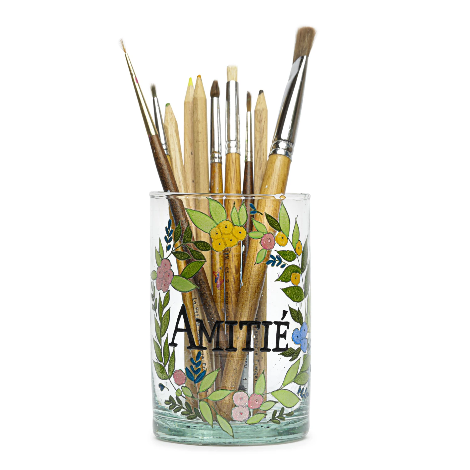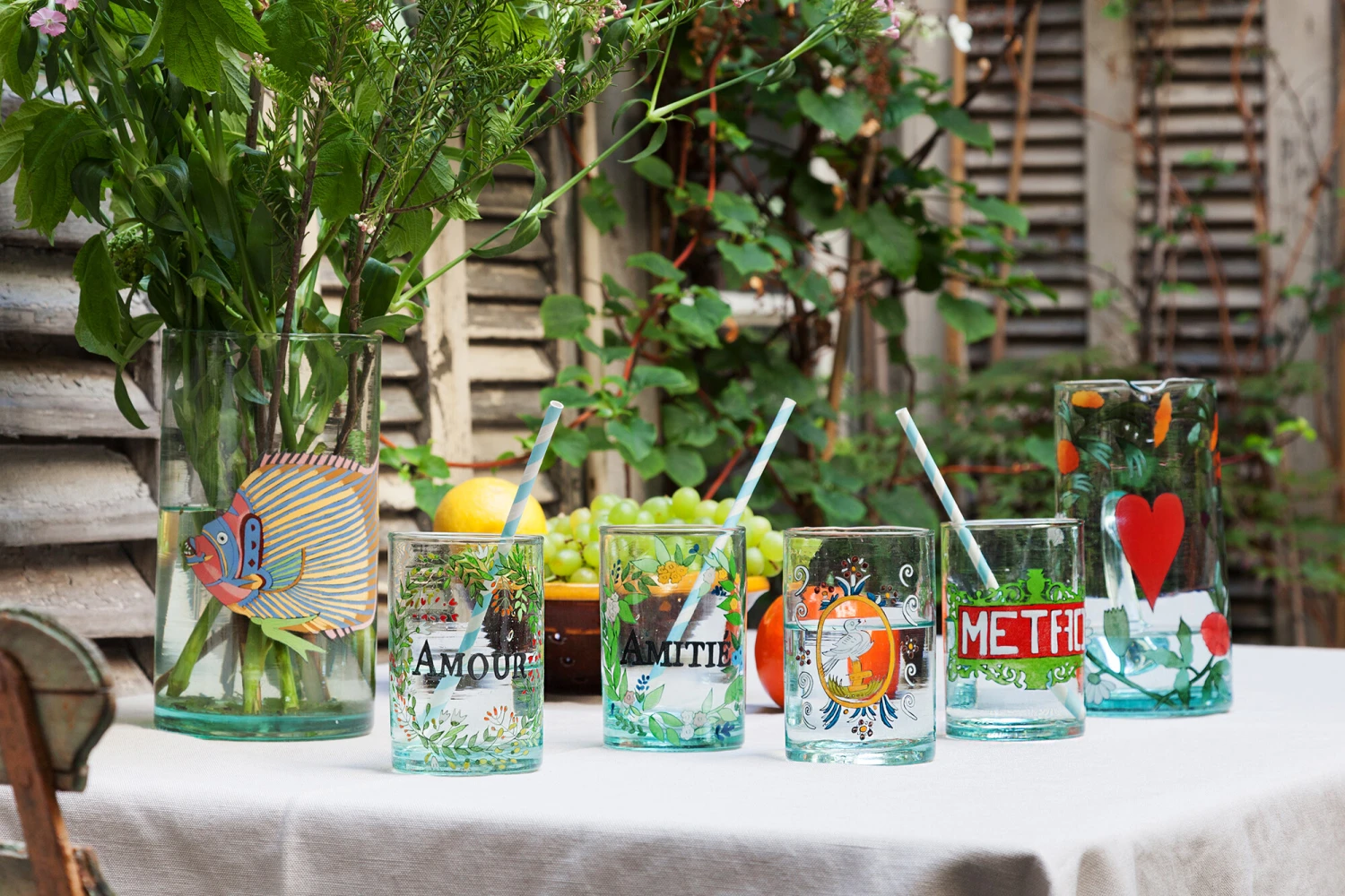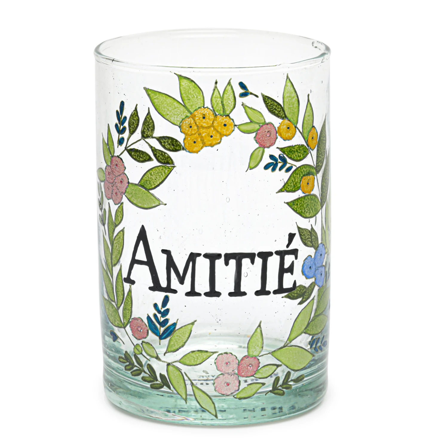 Marin Montagut a créé cette illustration à l’aquarelle pour mettre à l’honneur l’AMITIÉ au milieu d’un écrin coloré et fleuri ; et vous inviter à partager ce délicat verre artisanal avec vos amis.