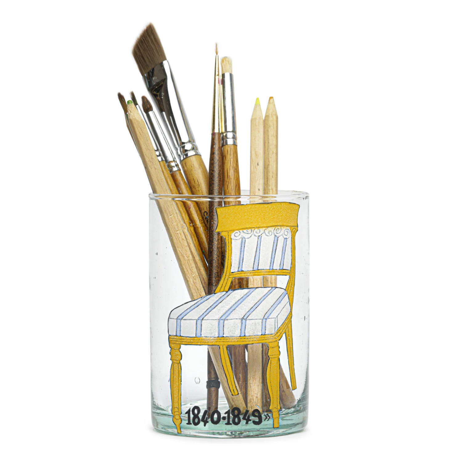 Cette chaise jaune au rayures bleues et blanches trône au milieu de l’atelier de Marin Montagut, qui l’utilise tous les jours pour s’asseoir à sa table et y concevoir ses illustrations à l’aquarelle. Elle est mise à l’honneur sur ce délicat verre artisanal.