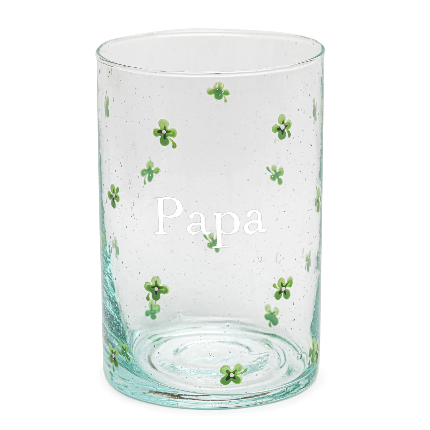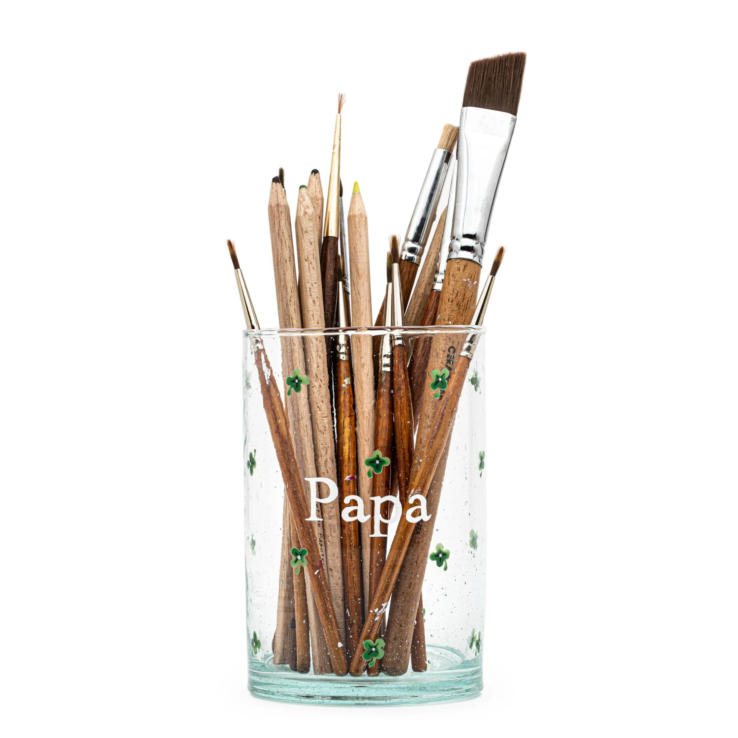 Ce verre délicat entièrement peint à la main est illustré de petits trèfles à quatre feuilles et du mot “Chance”. Son utilité est multiple : verre à boire, mini vase pour des petits bouquets ou pot à crayons…laissez votre imagination vous guider !