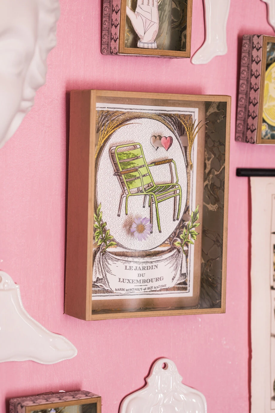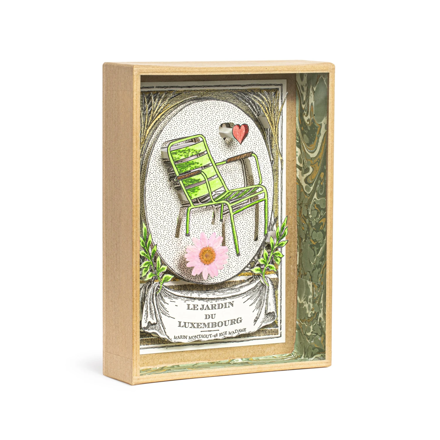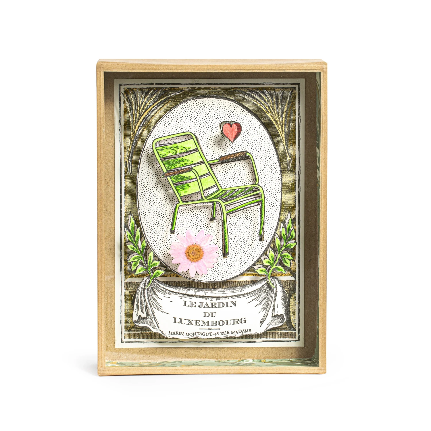 La Vitrine à Merveilles est un objet en volume 3D, confectionnée dans les ateliers de Marin Montagut à Paris, entièrement PEINTE ET DÉCOUPÉE À LA MAIN. Chaque pièce est numérotée. La structure est en papier mâché et fermé par une vitre en verre, le tout conservé par un couvercle de protection, tel un écrin. La vitrine CHAISE DU LUXEMBOURG recèle en son intérieur une marguerite séchée en provenance du Jardin du Luxembourg. Un objet précieux à contempler sans modération.