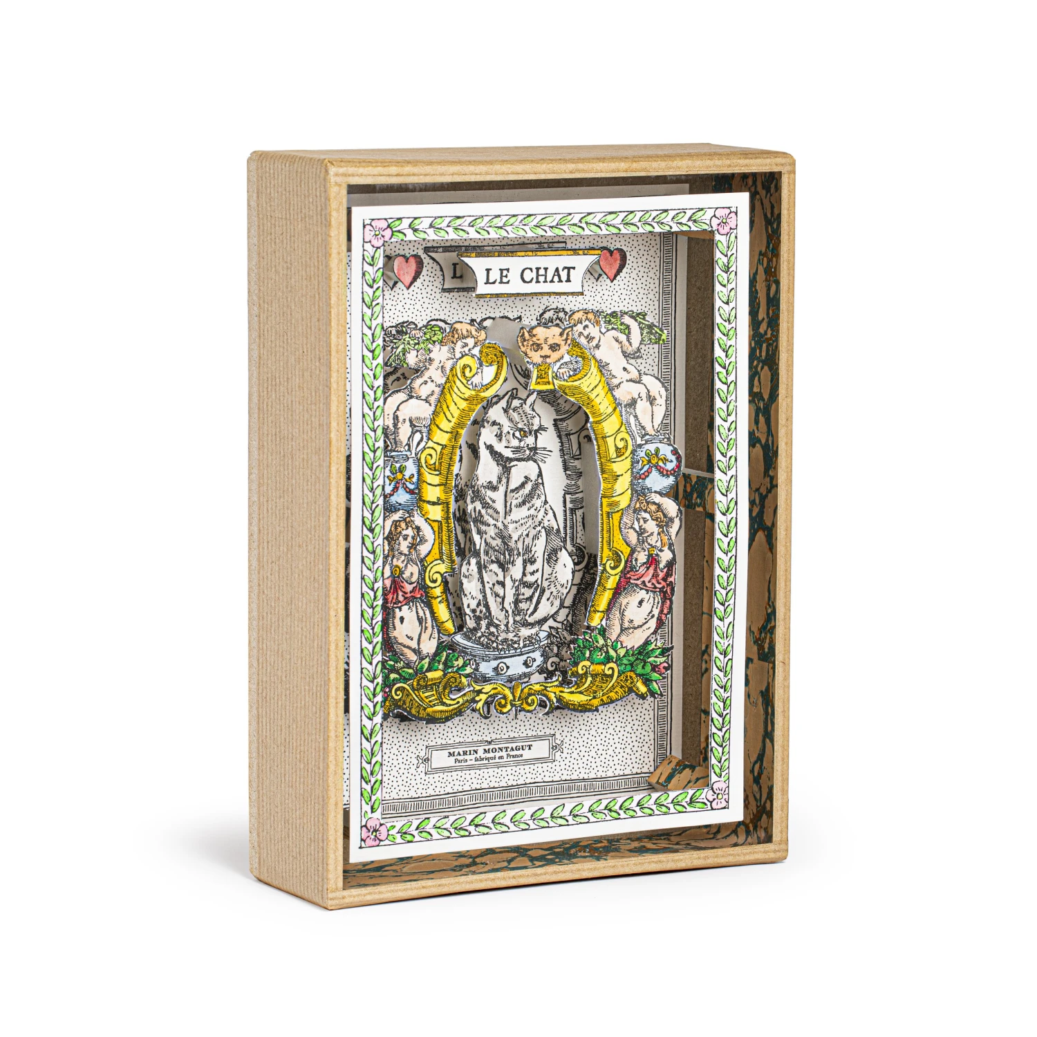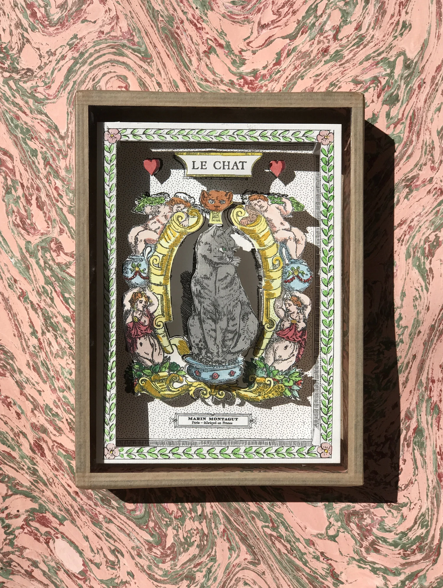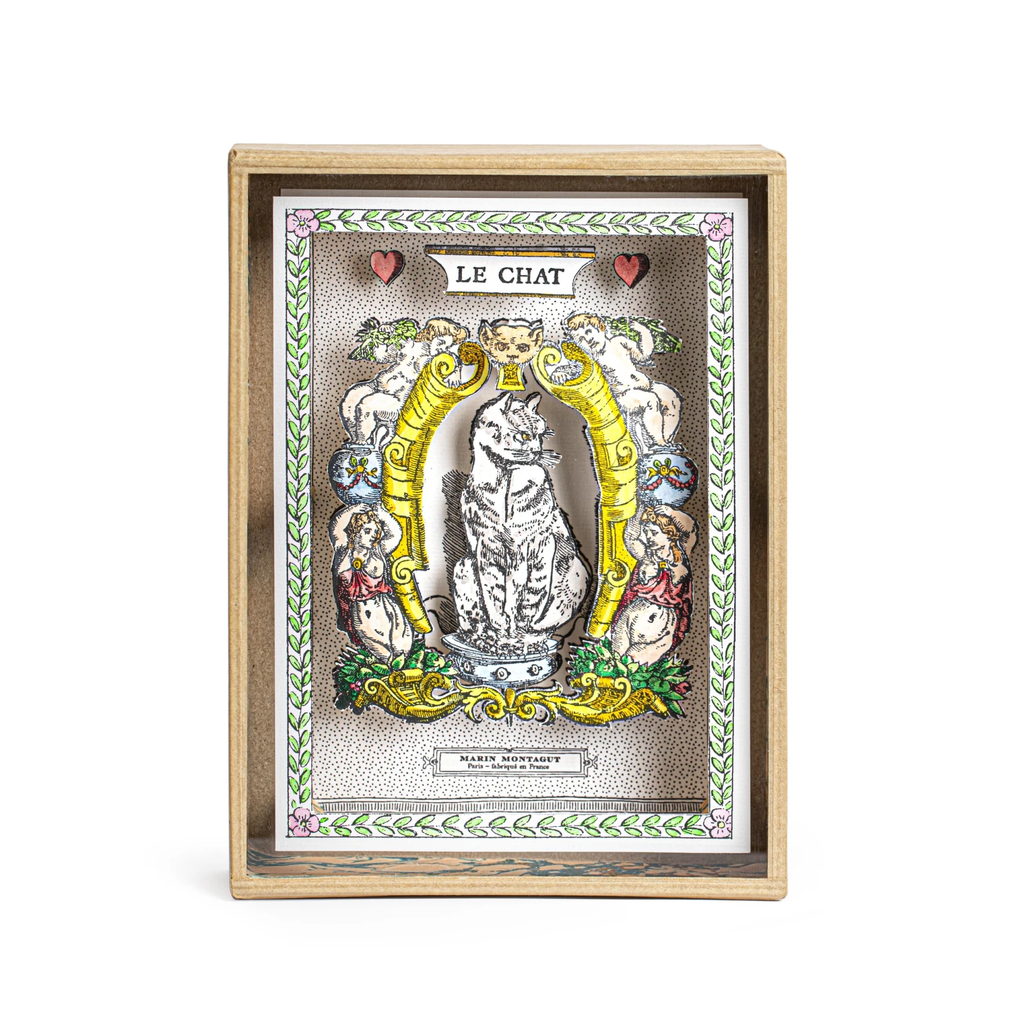 Ôde au maître de nos coeurs et de nos chaumières, LE CHAT MÉDAILLON est dédié aux amoureux de ces petits félins. L’illustration créée par Marin Montagut est déclinée ici sous la forme d’une Vitrine À Merveilles.