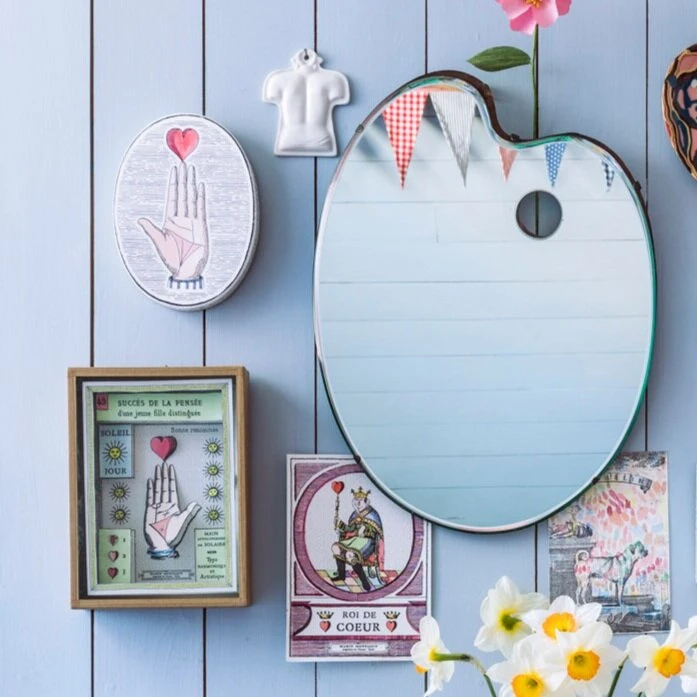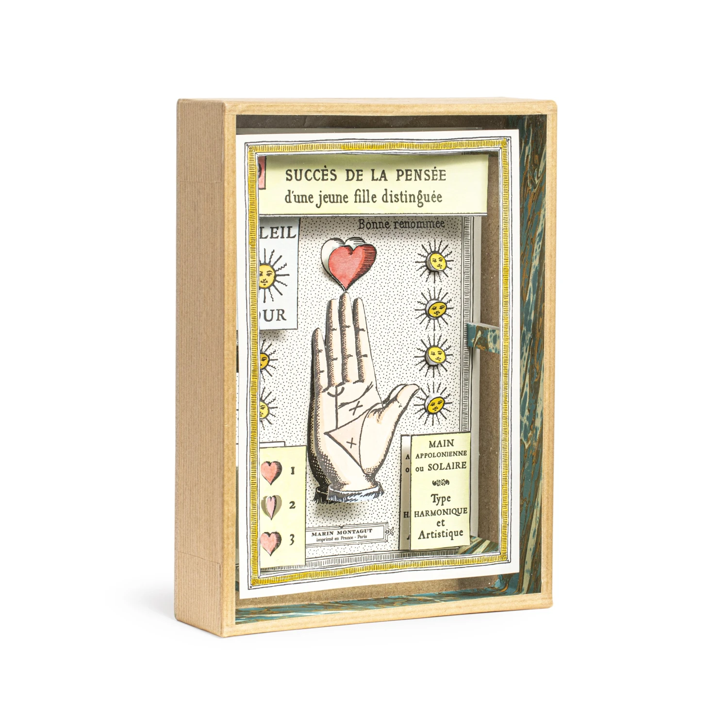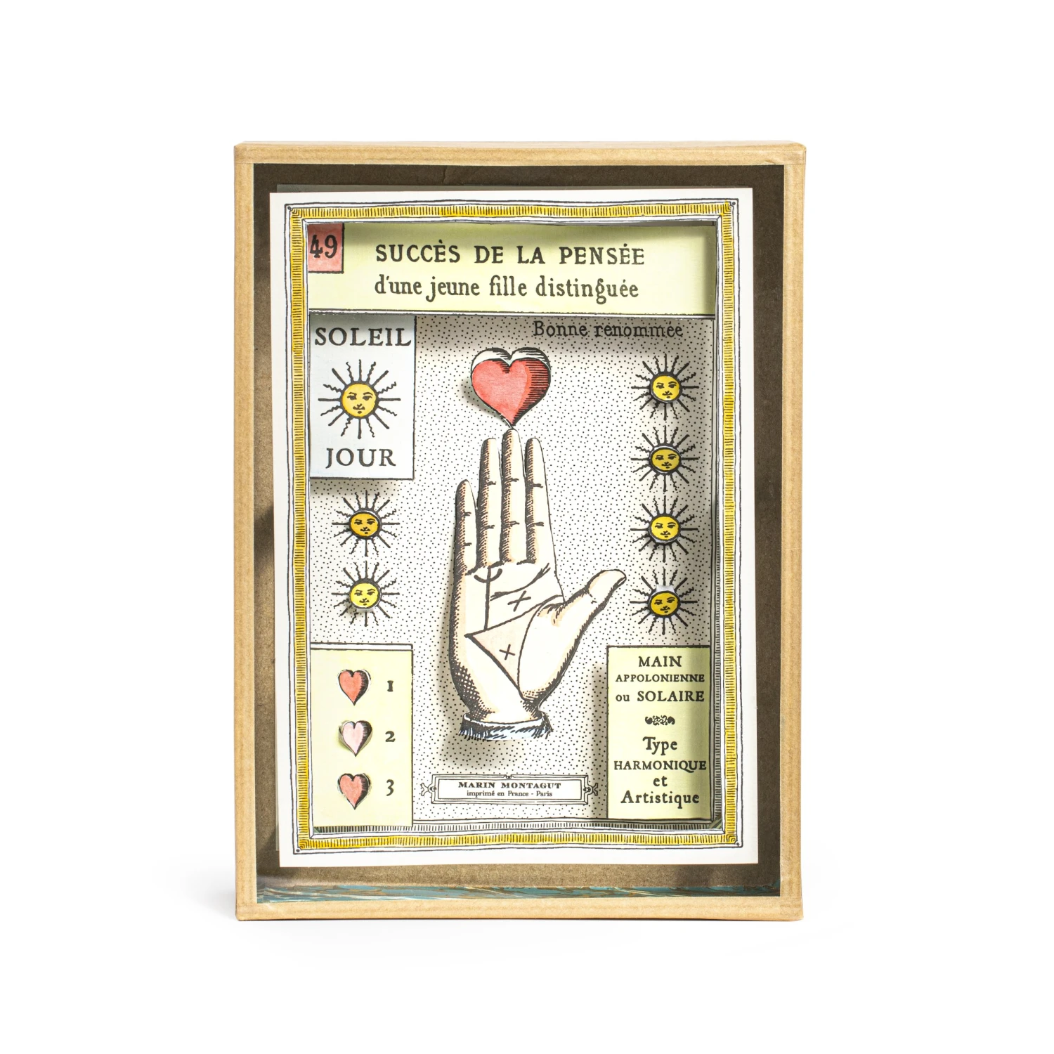 Inspiré de la symbolique mystérieuse et poétique du tarot, l’illustration COEUR SUR LA MAIN de Marin Montagut est déclinée ici sous la forme d’une Vitrine À Merveilles.