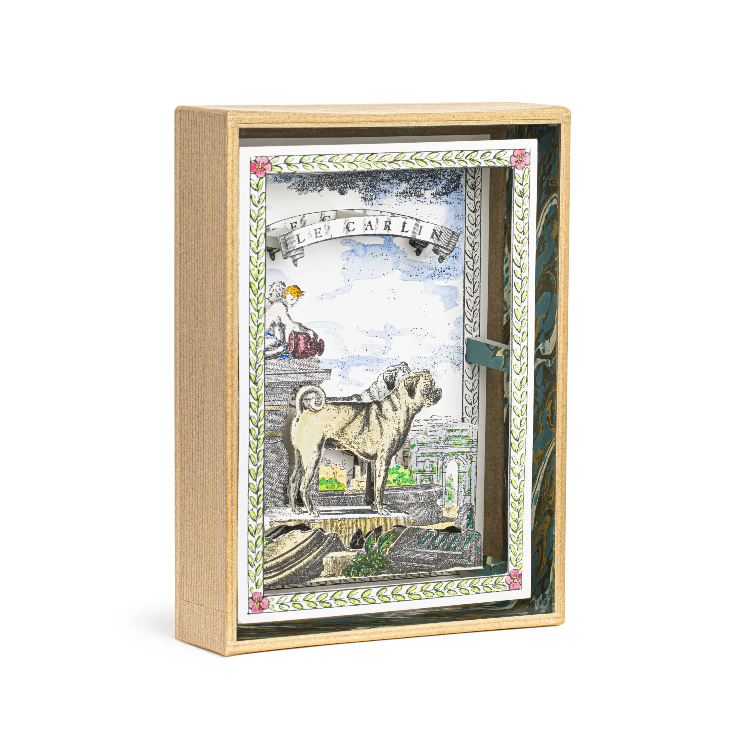 La Vitrine À Merveilles est un objet en volume 3D, confectionnée dans les ateliers de Marin Montagut à Paris, entièrement PEINTE ET DÉCOUPÉE À LA MAIN. Chaque pièce est numérotée. La structure est en papier mâché et fermé par une vitre en verre, le tout conservé par un couvercle de protection, tel un écrin. Un objet précieux à contempler sans modération.