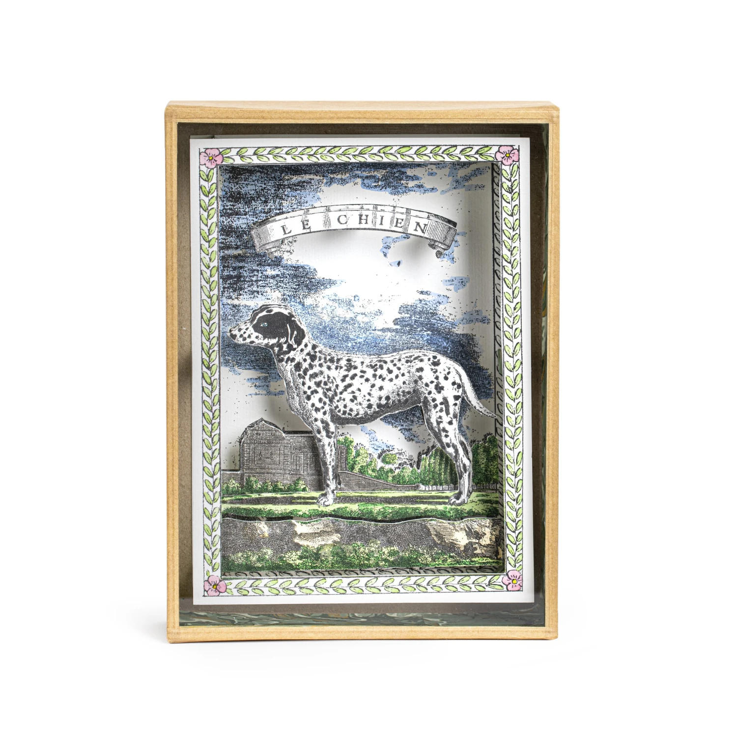 La Vitrine à Merveilles est un objet en volume 3D, confectionnée dans les ateliers de Marin Montagut à Paris, entièrement PEINTE ET DÉCOUPÉE À LA MAIN. Chaque pièce est numérotée. La structure est en papier mâché et fermé par une vitre en verre, le tout conservé par un couvercle de protection, tel un écrin. Un objet précieux à contempler sans modération.