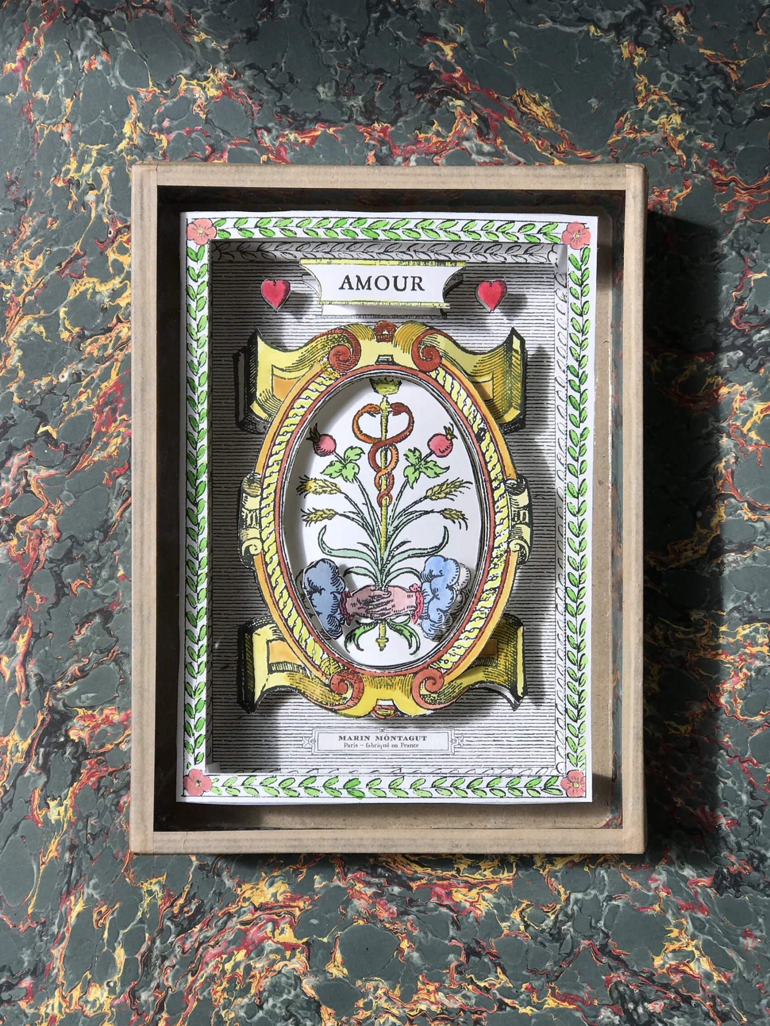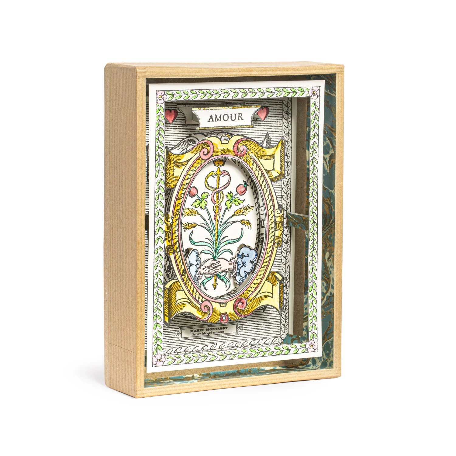 La Vitrine à Merveilles est un objet en volume 3D, confectionnée dans les ateliers de Marin Montagut à Paris, entièrement PEINTE ET DÉCOUPÉE À LA MAIN. Chaque pièce est numérotée. La structure est en papier mâché et fermé par une vitre en verre, le tout conservé par un couvercle de protection, tel un écrin. Un objet précieux à contempler sans modération.