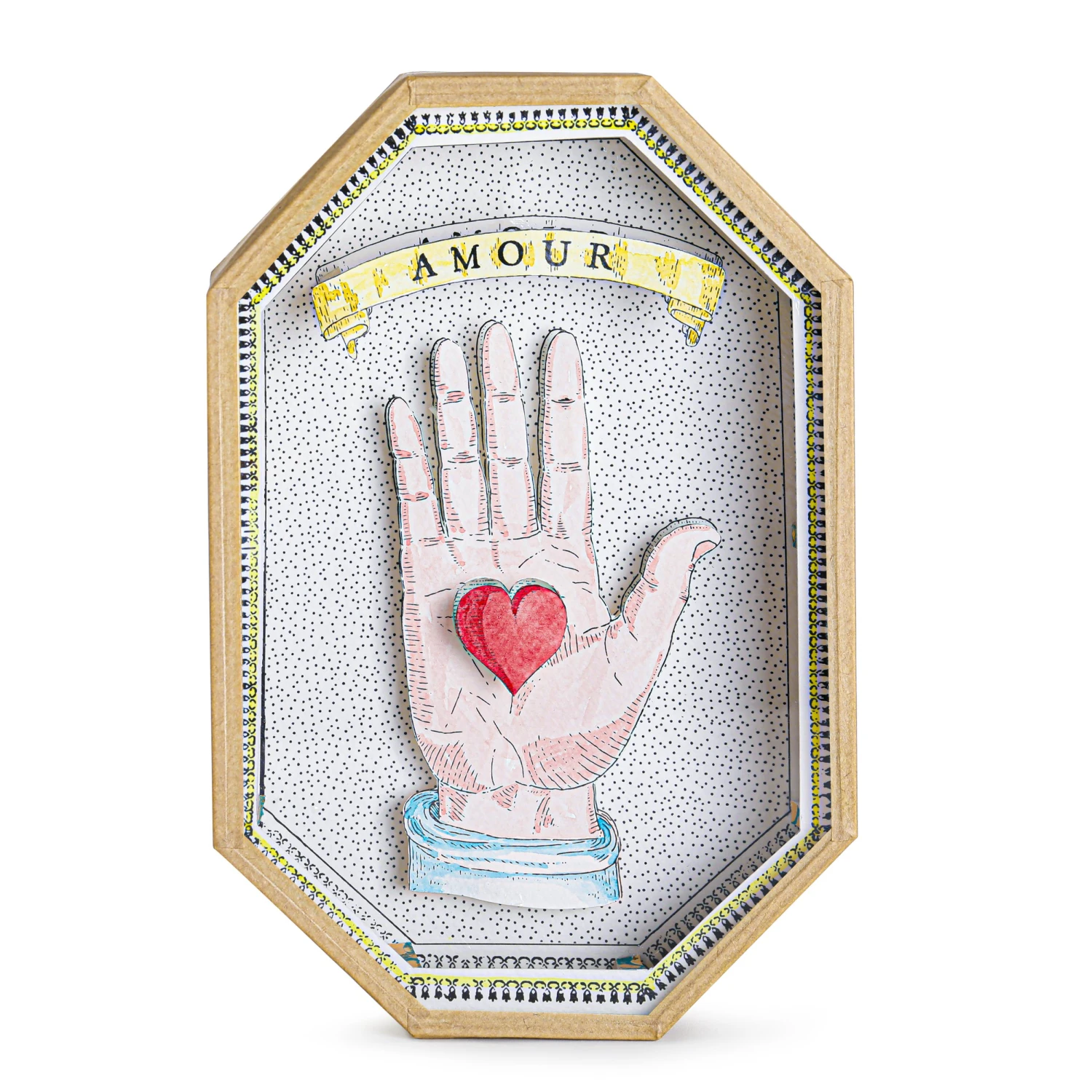 La Vitrine À Merveilles est un objet en volume 3D, confectionnée dans les ateliers de Marin Montagut à Paris, entièrement PEINTE ET DÉCOUPÉE À LA MAIN. Chaque pièce est numérotée. La structure est en papier mâché et fermé par une vitre en verre, le tout conservé par un couvercle de protection, tel un écrin. Un objet précieux à contempler sans modération.
