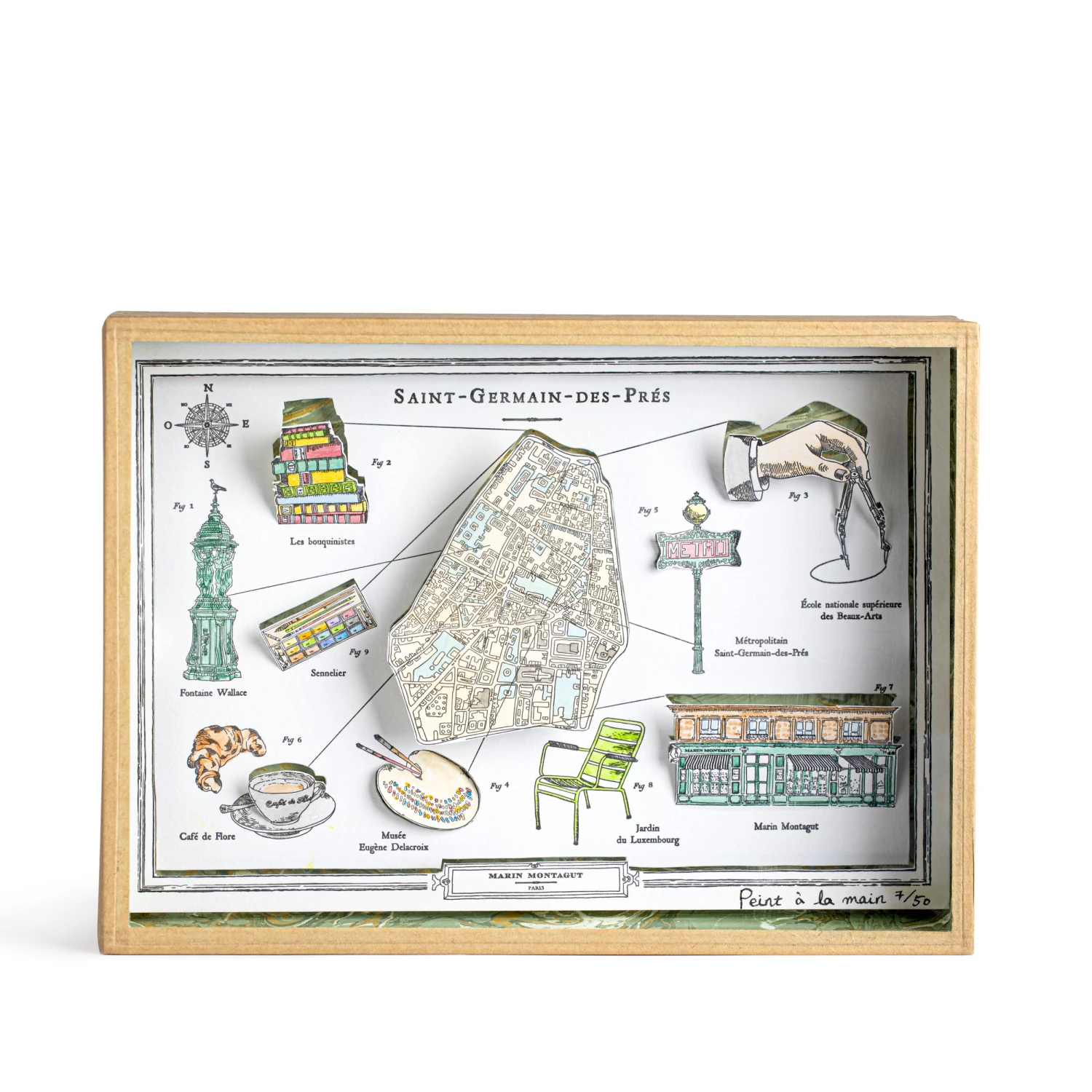 La Vitrine à Merveilles est un objet en volume 3D, confectionnée dans les ateliers de Marin Montagut à Paris, entièrement PEINTE ET DÉCOUPÉE À LA MAIN. Chaque pièce est numérotée. La structure est en papier mâché et fermé par une vitre en verre, le tout conservé par un couvercle de protection, tel un écrin. Un objet précieux à contempler sans modération.